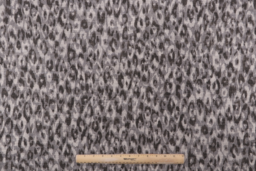 Kato Printed Drapery Fabric in Caraway by P Kaufmann showcases a sophisticated, animal-inspired motif rendered in a calm, modern neutral palette. The design layers charcoal, graphite, and warm greige tones to create dimensional rosettes that read as an abstract leopard pattern rather than a literal animal skin. Printed on a textured, linen-look plain-weave ground, the artwork retains soft, painterly edges that give the surface movement without appearing busy. The coloration leans neutral and versatile, balancing cool gray with a subtle taupe undertone so it coordinates easily with both warm and cool schemes. The pattern is closely spaced and allover, minimizing visible seams and creating a continuous field of texture. The base cloth offers a medium weight with a smooth, slightly dry hand and a matte finish that keeps the look refined and not shiny. The overall effect is chic and graphic at a comfortable scale, delivering depth and interest while remaining grounded in timeless neutrals.
