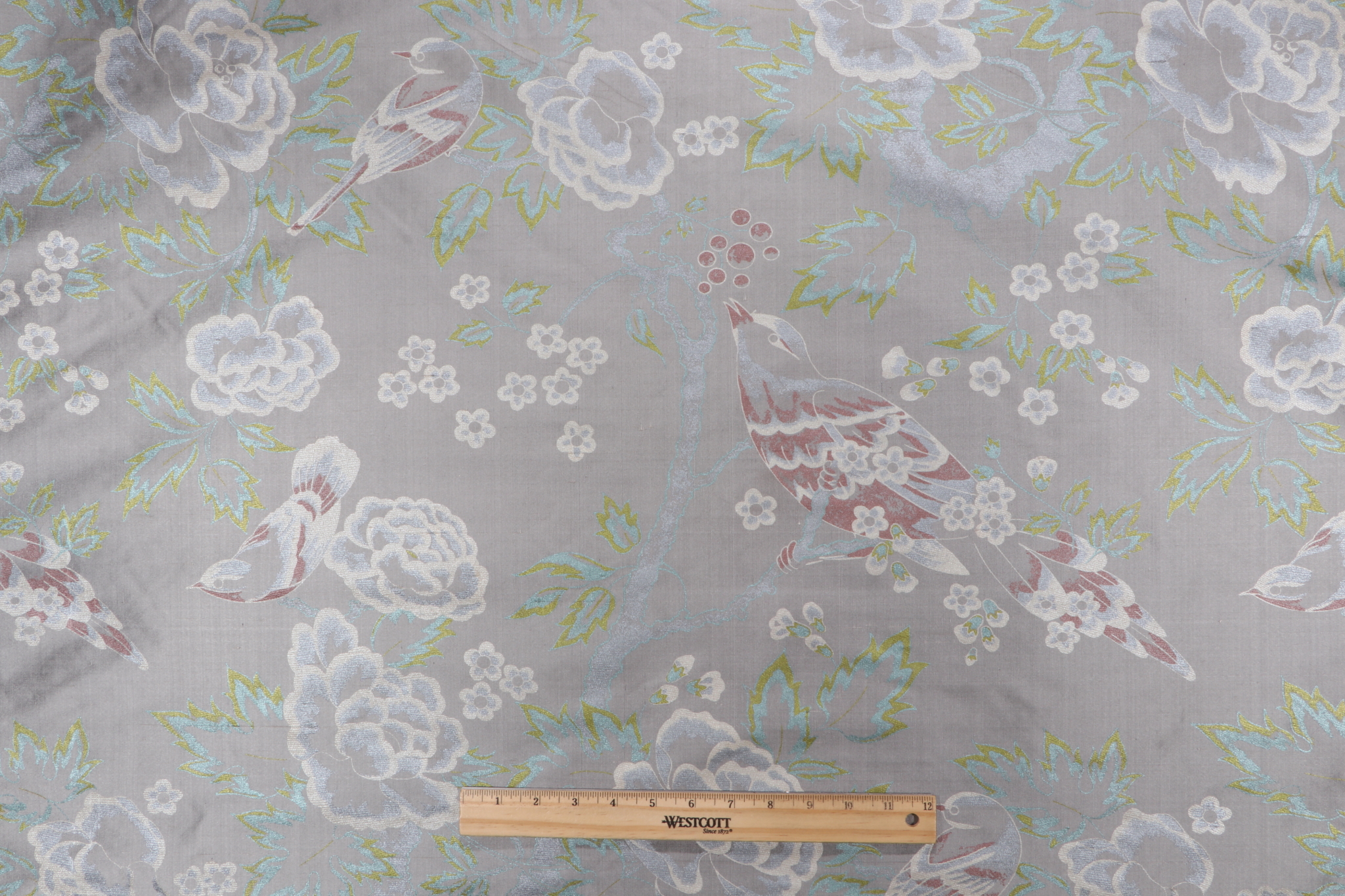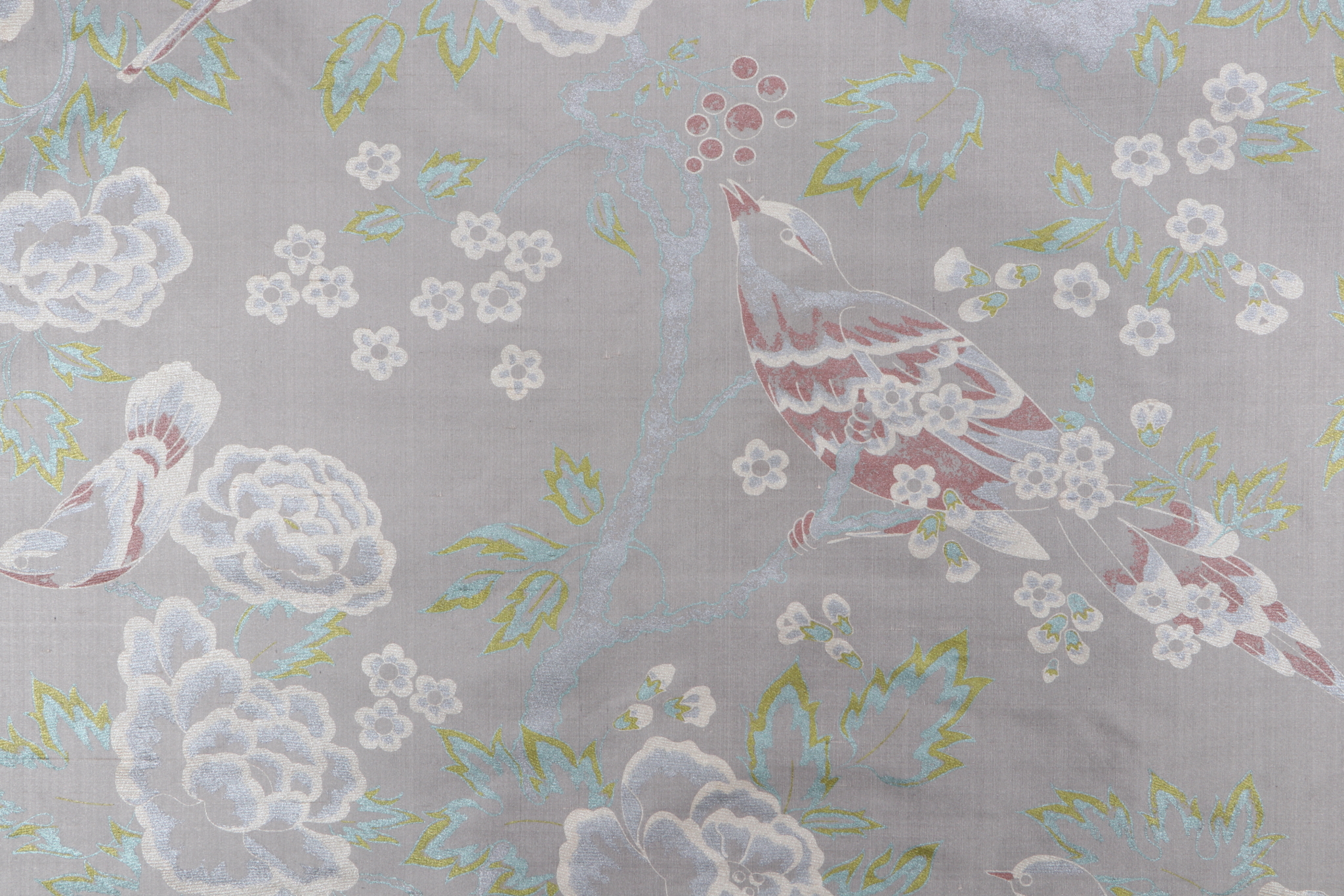 Featured here is 6.38 yards of Songbirds printed silk drapery fabric from Thibaut. Great for creating high-end pillow shams, an ottoman, or even an upholstered vanity stool. It can also be used to make elegant fabric handbags or decorative wall panels. Note: If you are unsure about the suitability of this fabric for your specific use case please contact us prior to ordering.