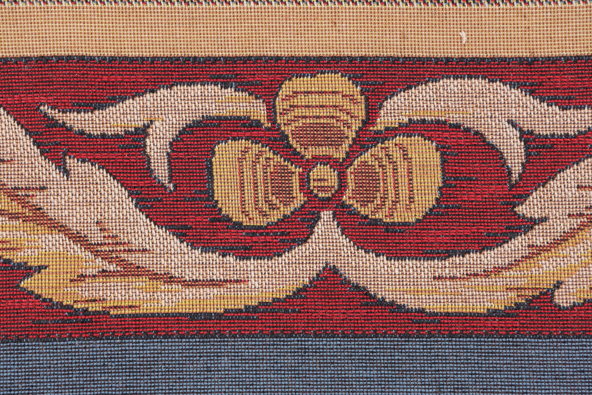 Scalamandre Bordure Medieval 6'' Tapestry Border Fabric in Gold/Blue/Red is a remnant. Fabric remnants refer to leftover pieces of fabric from production runs at manufacturing sites or pieces that remain from by the yard stock. The lengths of these remnants can vary from a few inches to several yards and are typically sold at a reduced price, since they represent remaining inventory.