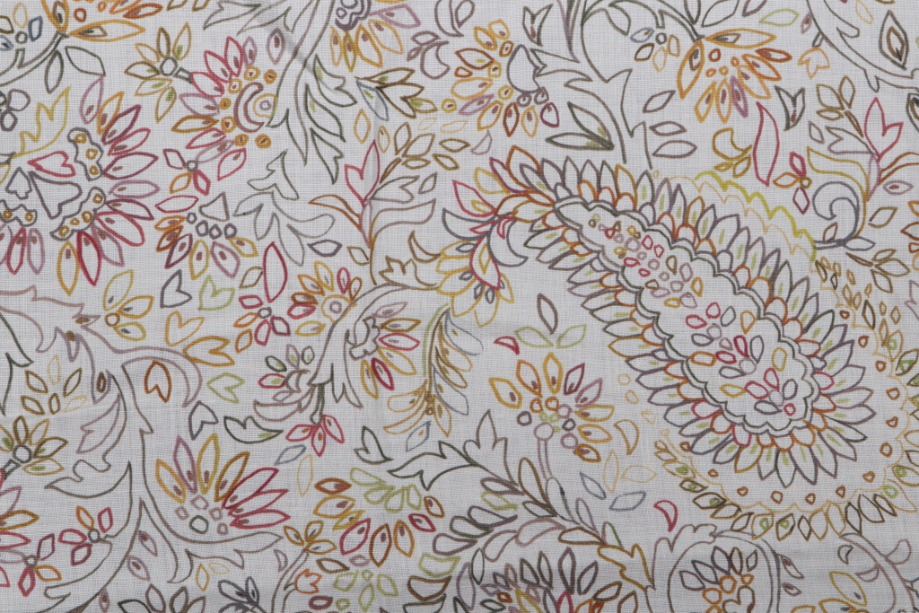 Grey Watkins Crayola Paisley Printed Linen Drapery Fabric in Taupe/Multi is a remnant, which is sold as a whole piece.