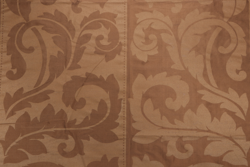Thibaut Frotolla Silk F91302 Printed Silk Decorator Fabric in Brown is a remnant. Fabric remnants refer to leftover pieces of fabric from production runs at manufacturing sites or pieces that remain from by the yard stock. The lengths of these remnants can vary from a few inches to several yards and are typically sold at a reduced price, since they represent remaining inventory.