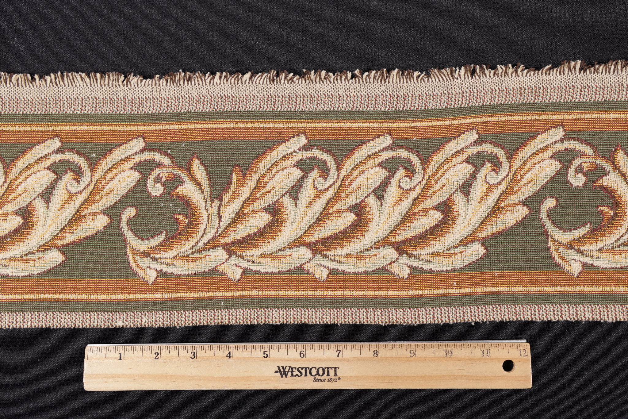 Scalamandre Corinthe Border 6'' Tapestry Border Fabric in Green/Gold is a remnant. Fabric remnants refer to leftover pieces of fabric from production runs at manufacturing sites or pieces that remain from by the yard stock. The lengths of these remnants can vary from a few inches to several yards and are typically sold at a reduced price, since they represent remaining inventory.