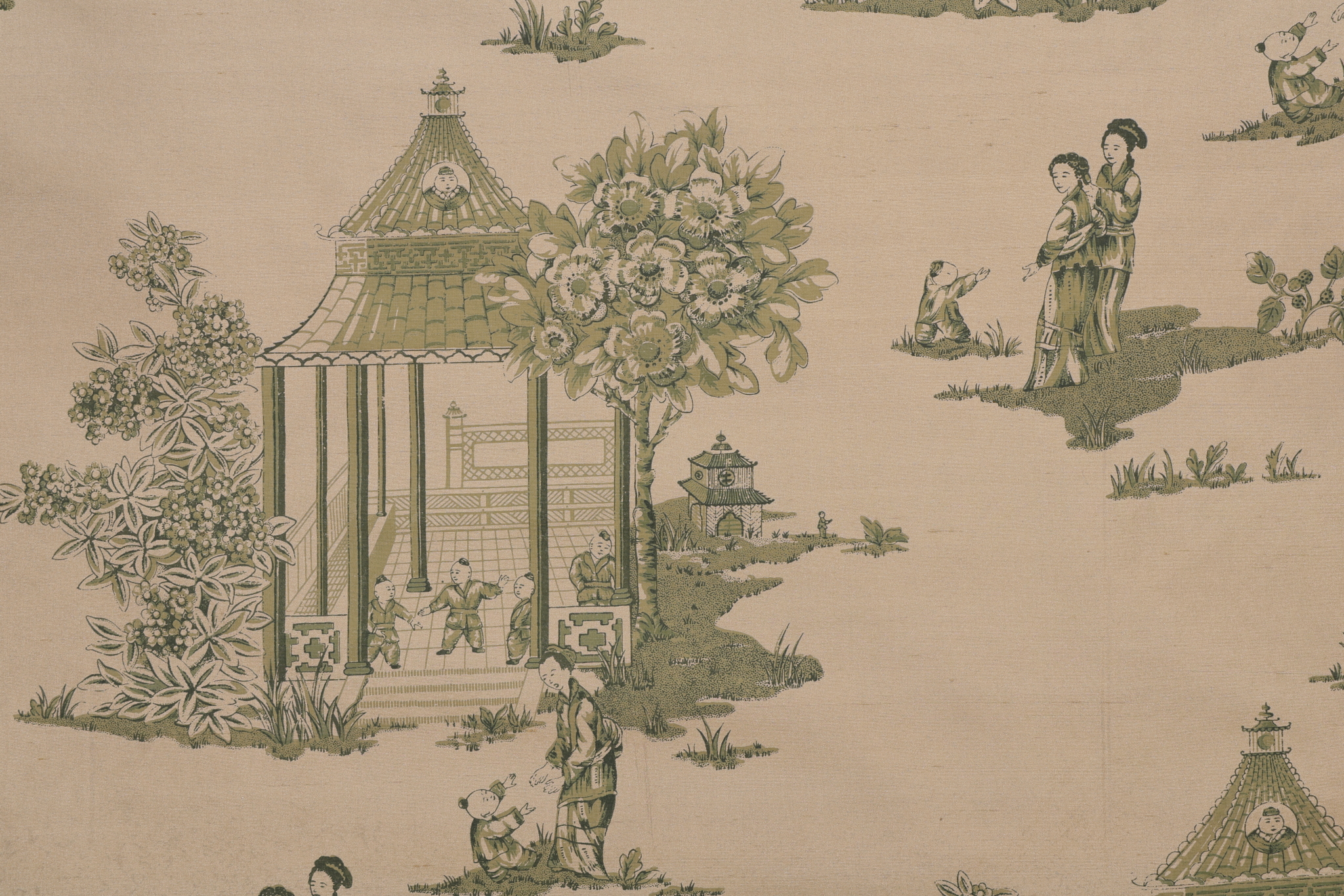 Pagoda Toile Printed Silk Decorator Fabric in Olive Details