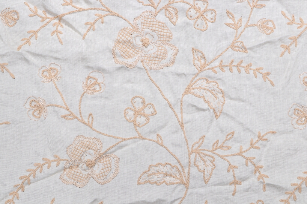 Grey Watkins Kamala Embroidered Drapery Fabric in Cream is a remnant. Fabric remnants refer to leftover pieces of fabric from production runs at manufacturing sites or pieces that remain from by the yard stock. The lengths of these remnants can vary from a few inches to several yards and are typically sold at a reduced price, since they represent remaining inventory.