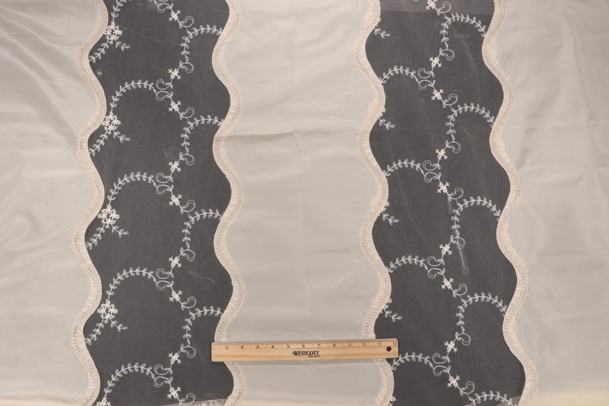 Old World Weavers Dorisse Sheer Embroidered Drapery Fabric in Chantilly for Scalamandre is a remnant. Fabric remnants refer to leftover pieces of fabric from production runs at manufacturing sites or pieces that remain from by the yard stock. The lengths of these remnants can vary from a few inches to several yards and are typically sold at a reduced price, since they represent remaining inventory.