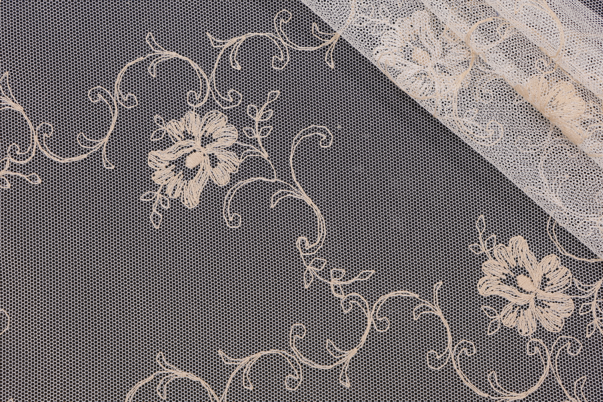 Scalamandre Fleurville 120 inch Sheer Embroidered Drapery Fabric in Beurre Beige is a remnant. Fabric remnants refer to leftover pieces of fabric from production runs at manufacturing sites or pieces that remain from by the yard stock. The lengths of these remnants can vary from a few inches to several yards and are typically sold at a reduced price, since they represent remaining inventory.