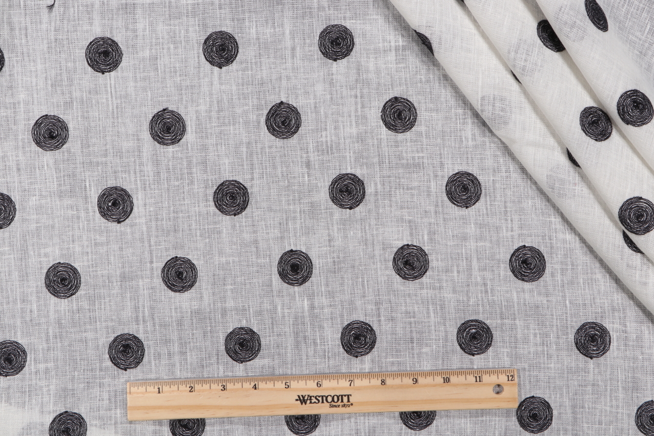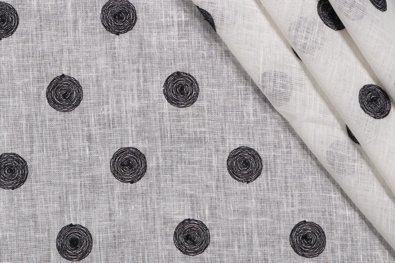 Lino Textiles Daisy Embroidered Linen Sheer Drapery Fabric in Black on Ivory Details