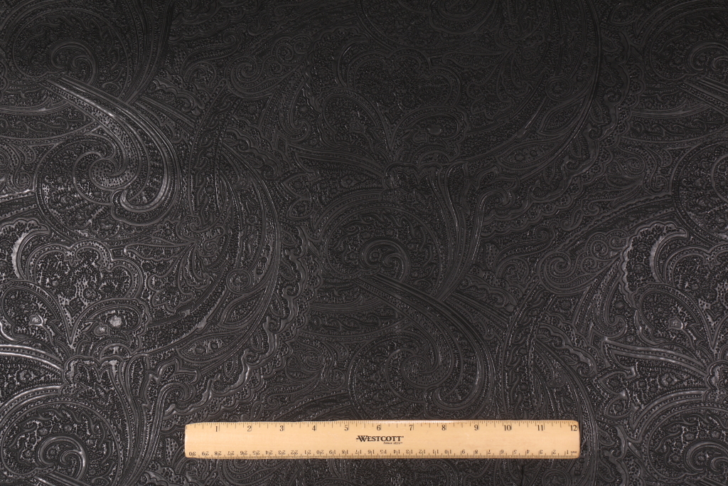 Richloom Valpariso Embossed Vinyl Upholstery Fabric in Black. This high end woven upholstery weight fabric is suited for uses requiring a more durable designer fabric. Uses include any upholstery project, sofas, chairs, dining chairs, pillows, certain types of window treatments, handbags and craft projects.