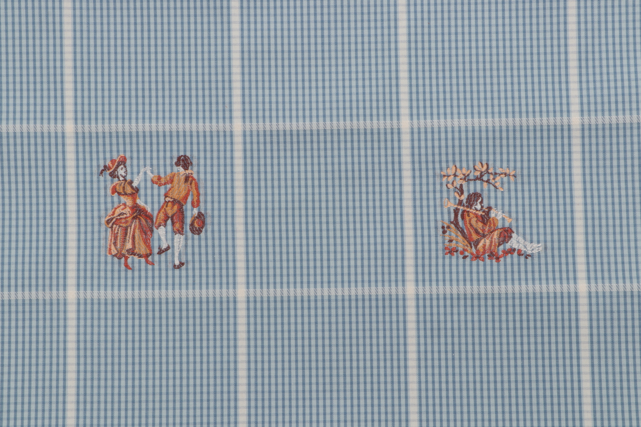 Scalamandre Fete Champetre Printed Cotton Drapery Fabric in Bleu is a remnant, which is sold as a whole piece.
