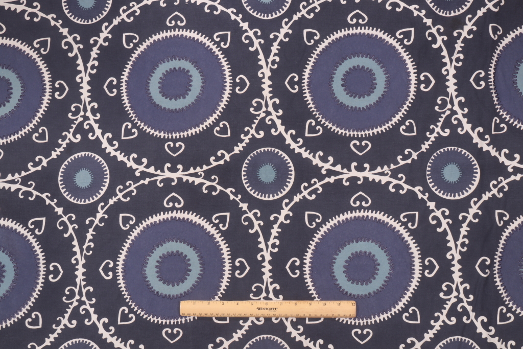 Beacon Hill Samarkand Embroidered Cotton Drapery Fabric in Indigo. This high-end woven decorator fabric is suited for multiple project applications. The weight is excellent for drapery projects, decorative pillows, coverlets, shams and light duty upholstery projects.