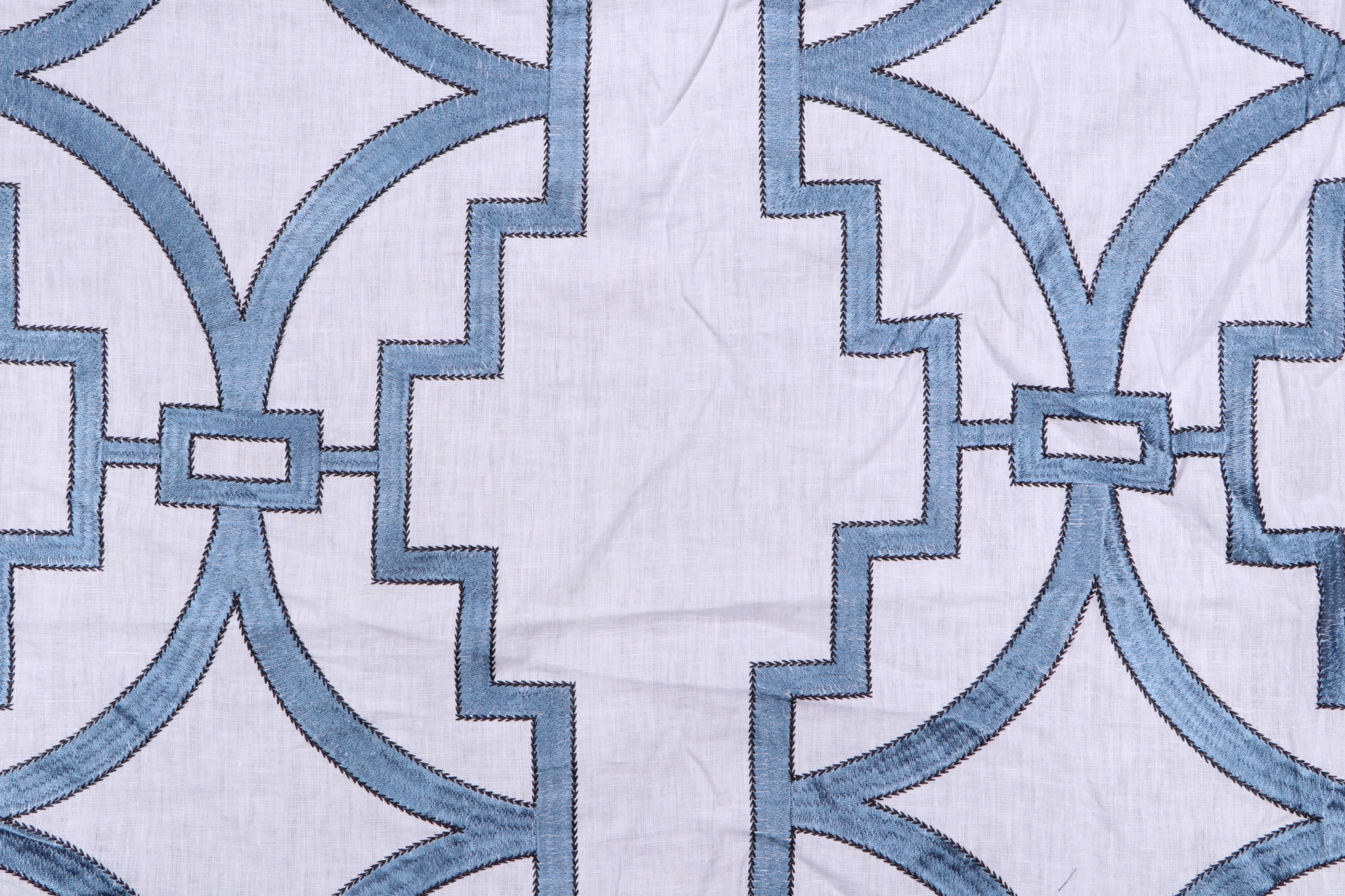 Anna French Songyue W736144 Embroidered Drapery Fabric in Blue for Thibaut is a remnant. Fabric remnants refer to leftover pieces of fabric from production runs at manufacturing sites or pieces that remain from by the yard stock. The lengths of these remnants can vary from a few inches to several yards and are typically sold at a reduced price, since they represent remaining inventory.