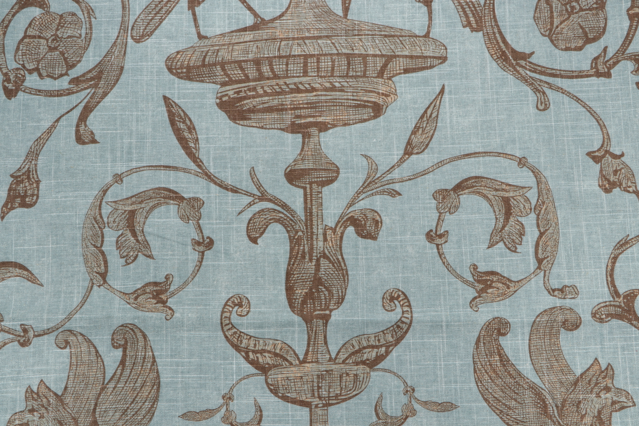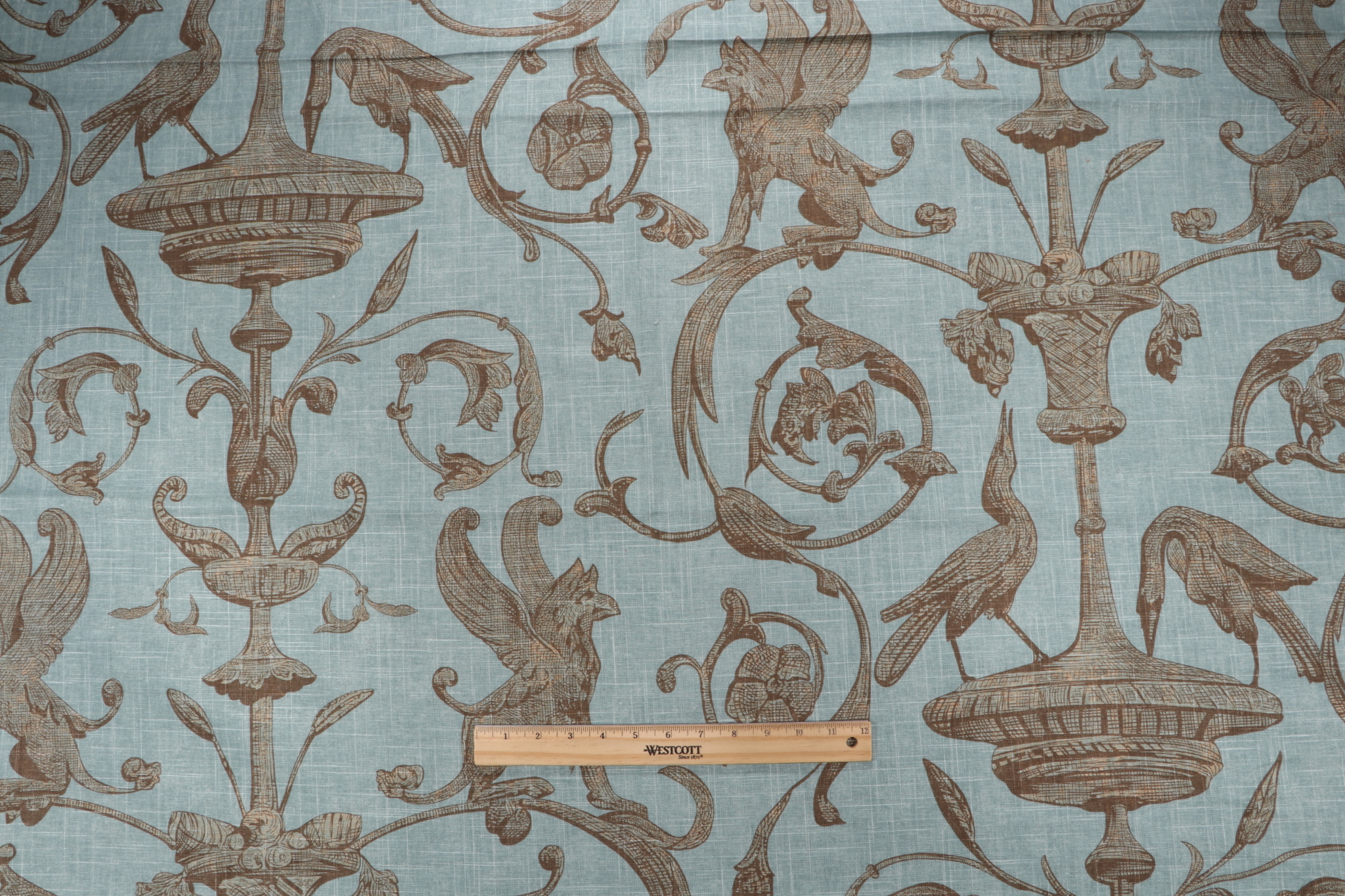 Thibaut Renaissance F91315 Printed Linen Blend Drapery Fabric in Aqua is a remnant, which is sold as a whole piece.