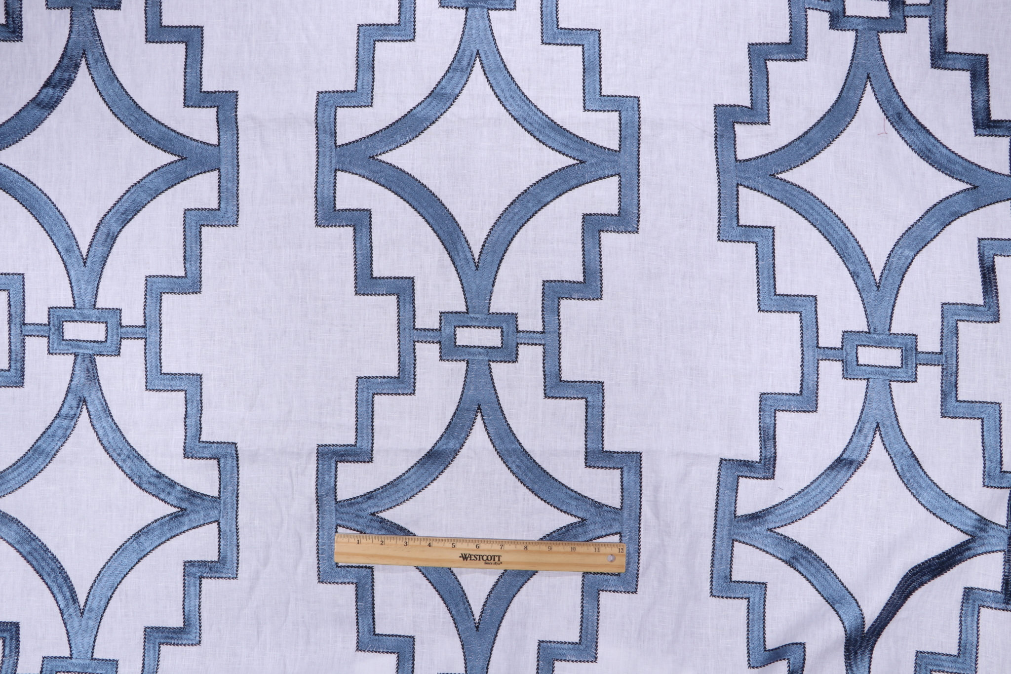 Anna French Songyue W736144 Embroidered Drapery Fabric in Blue for Thibaut is a remnant. Fabric remnants refer to leftover pieces of fabric from production runs at manufacturing sites or pieces that remain from by the yard stock. The lengths of these remnants can vary from a few inches to several yards and are typically sold at a reduced price, since they represent remaining inventory.