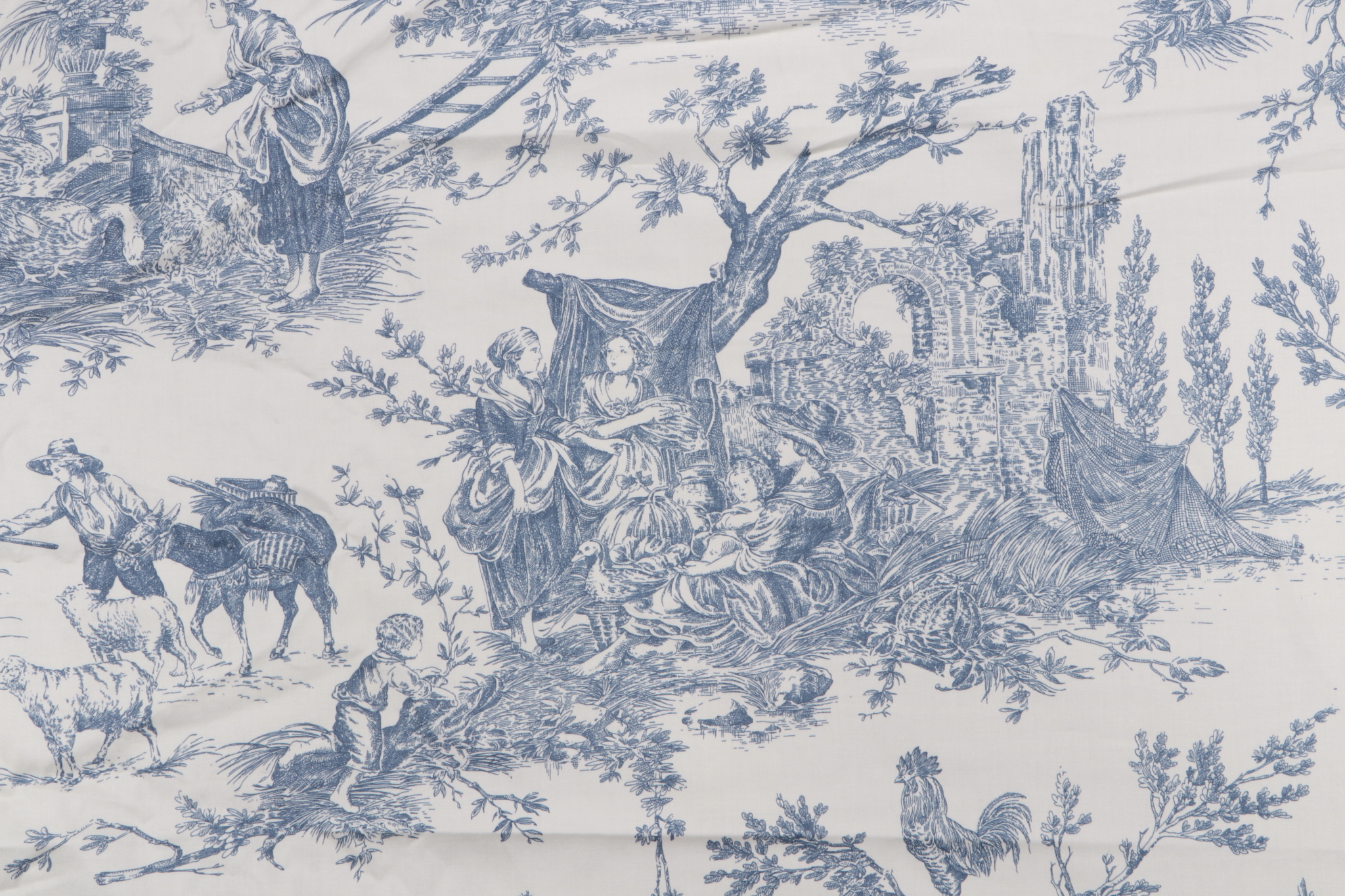 Thibaut Chateau De Loir F97302 Printed Cotton Drapery Fabric in Blue on Cream is a remnant. Fabric remnants refer to leftover pieces of fabric from production runs at manufacturing sites or pieces that remain from by the yard stock. The lengths of these remnants can vary from a few inches to several yards and are typically sold at a reduced price, since they represent remaining inventory.