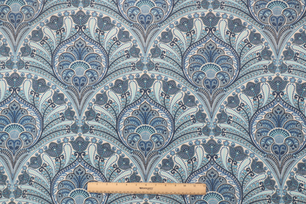 Tommy Bahama Crescent Beach Printed Polyester Outdoor Fabric in Rip Tide. This printed indoor/outdoor fabric is perfect for any project where the fabric will be exposed to the weather. Uses include cushions, tablecloths, upholstery projects, decorative pillows and craft projects. This fabric has a slightly stiff feel but is easy to work with.
