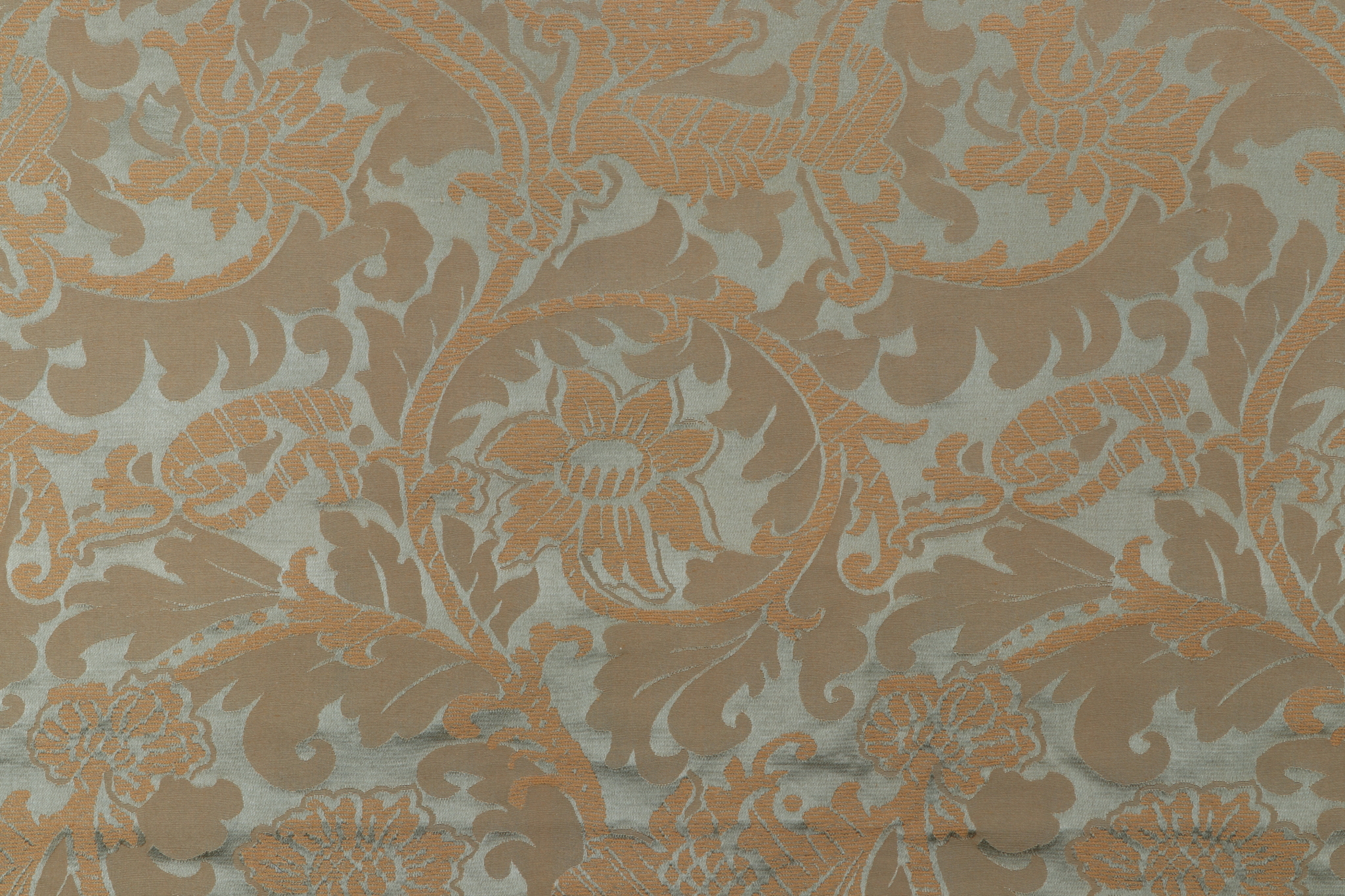 Scalamandre Corinthus Damask Upholstery Fabric in Sky Gold is a remnant. Fabric remnants refer to leftover pieces of fabric from production runs at manufacturing sites or pieces that remain from by the yard stock. The lengths of these remnants can vary from a few inches to several yards and are typically sold at a reduced price, since they represent remaining inventory.