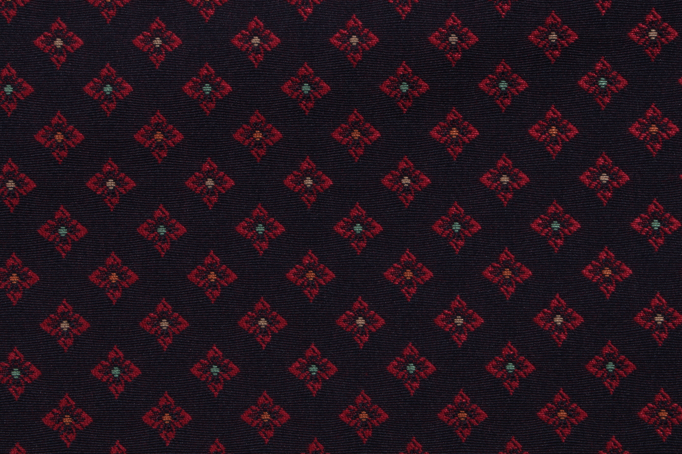 Scalamandre Stella Geometric Woven Upholstery Fabric in Red on Navy is a remnant. Fabric remnants refer to leftover pieces of fabric from production runs at manufacturing sites or pieces that remain from by the yard stock. The lengths of these remnants can vary from a few inches to several yards and are typically sold at a reduced price, since they represent remaining inventory.