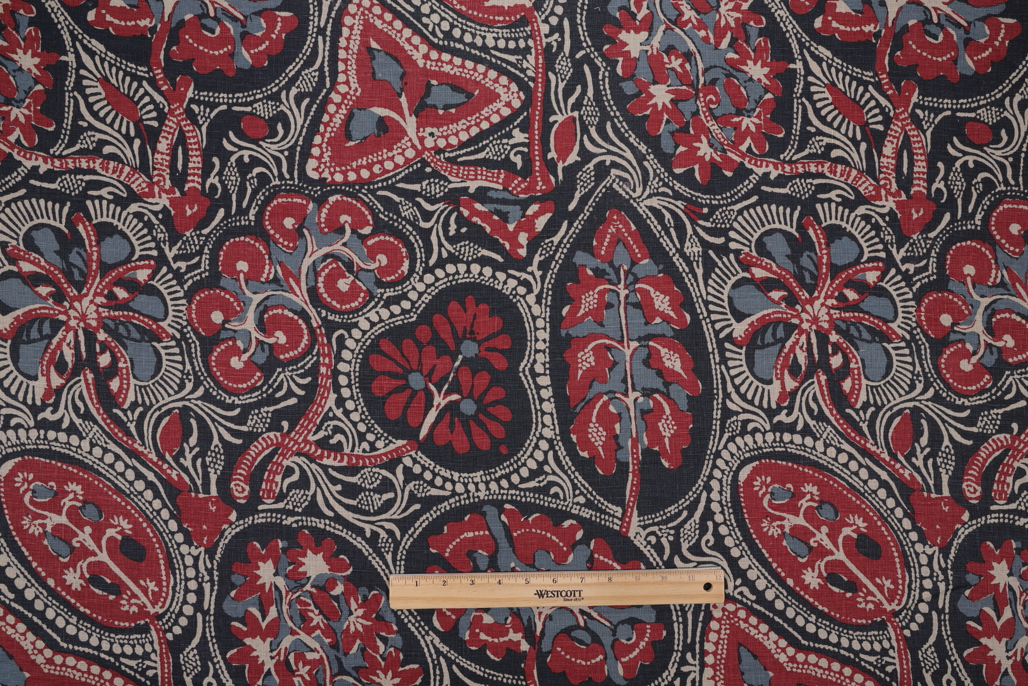 If you order a sample of Thibaut Cochin F988716 Table-Printed Linen Drapery Fabric in Blue and Red the size of the swatch you receive will be approximately 4" x 6". This is enough fabric to verify color and texture, but may not be large enough to capture an entire pattern.