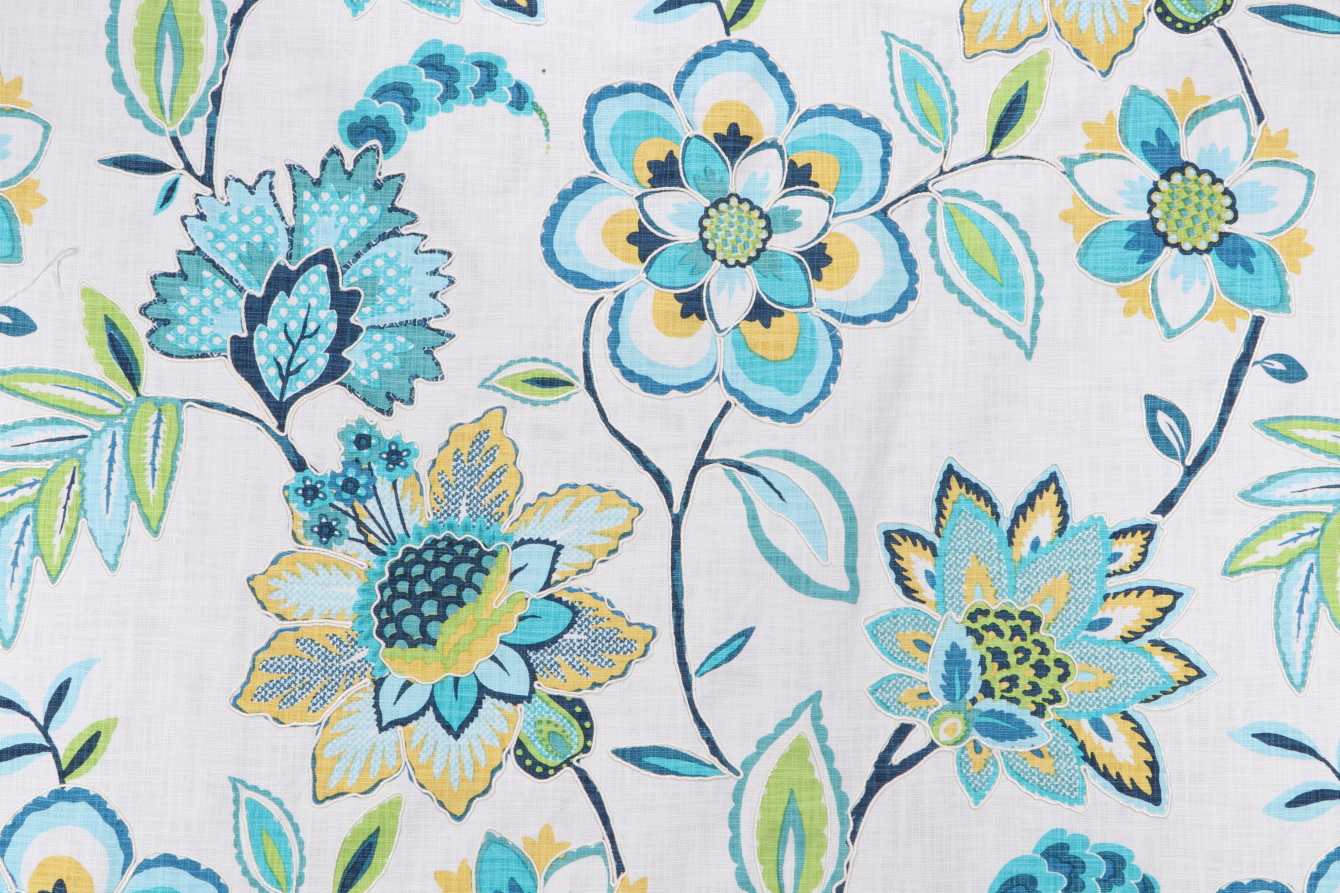 Offering 9.13 yards of Laylani, a fine printed & embroidered drapery fabric designed by Covington. With this amount, you can create 2 medium-length drapery panels (50 inches wide and 84 inches long) for standard 7-foot windows. Note: If you are unsure about the suitability of this fabric for your specific use case please contact us prior to ordering.