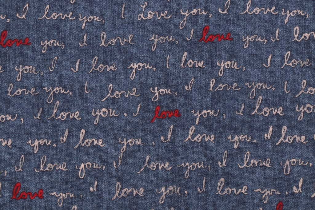 Ellen Degeneres I Love You Printed Cotton Drapery Fabric in Denim Details