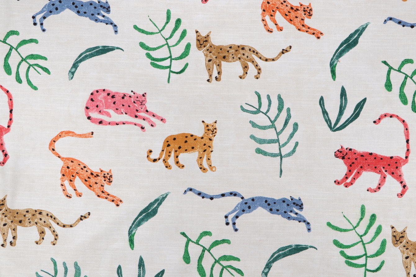 PK Lifestyles Prance Printed Cotton Drapery Fabric in Bloom showcases a lively, painterly menagerie set against a soft ivory ground. The design features spotted wildcats in coral, rose, tangerine, mustard, and denim blue, interspersed with sweeping green fronds and stylized leaves for buoyant energy and movement. The artwork reads crisp and saturated, with fine dotting and brush textures that bring dimension without heaviness. The print is arranged in a tossed, multidirectional layout that keeps the eye moving and avoids strict verticals, giving the surface a playful rhythm. The cotton base has a smooth hand with a subtle, natural slub that gently softens the palette and adds a touch of texture. Color balance is thoughtfully tuned; warm cat tones are cooled by layered greens and blue, leaving comfortable negative space so the pattern breathes. Any cropped motifs visible in the sample image simply reflect the photo’s edges; the full repeat continues seamlessly across the width and length. This pattern delivers standout character, confident color, and polished print quality on a dependable cotton ground.