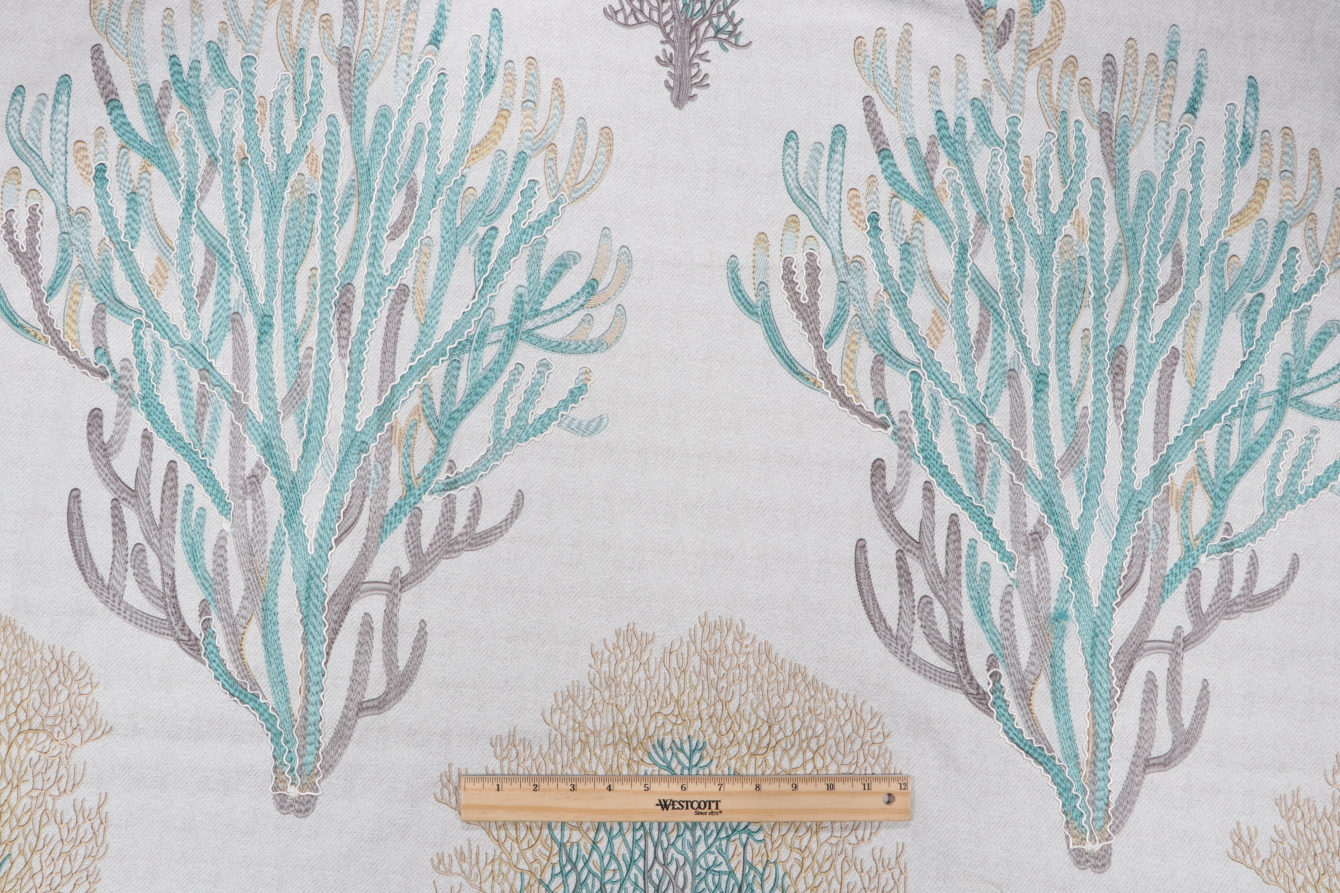0.88 Yards Lino Bermuda Coral Reef Embroidered & Printed Cotton Drapery Fabric in Caribbean Nutmeg Details