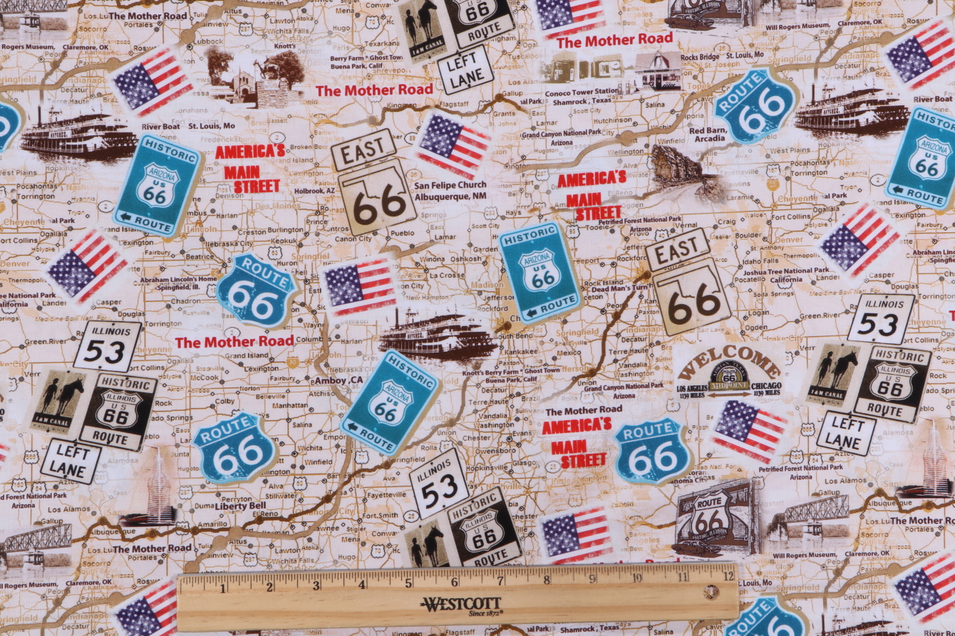 Michael Searle Fabrics of SoHo Route 66 - Route 66 Antique Map Printed Cotton Craft Fabric in Natural for Timeless Treasures is a remnant, which is sold as a whole piece.