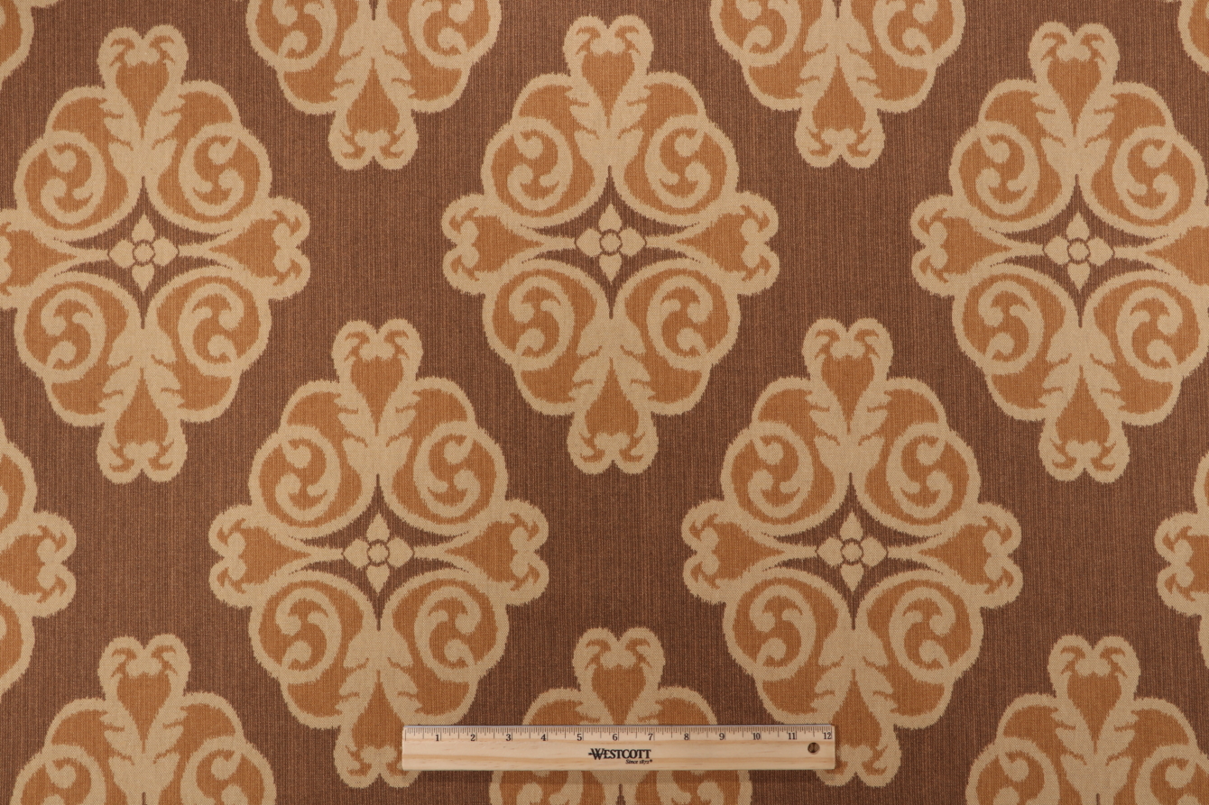 Here we have 5 yards of Montgomery, a beautiful printed linen blend drapery fabric from Thibaut. This fabric is suitable for short curtains, decorative tiebacks, or smaller window treatments. Thibaut fabrics blend classic and modern aesthetics, with a reputation for sophisticated prints and rich textures that elevate any interior design scheme. Peru, sienna, saddle brown, dark khaki, and rosy brown feature prominently in this fabric. Note: If you are unsure about the suitability of this fabric for your specific use case please contact us prior to ordering.