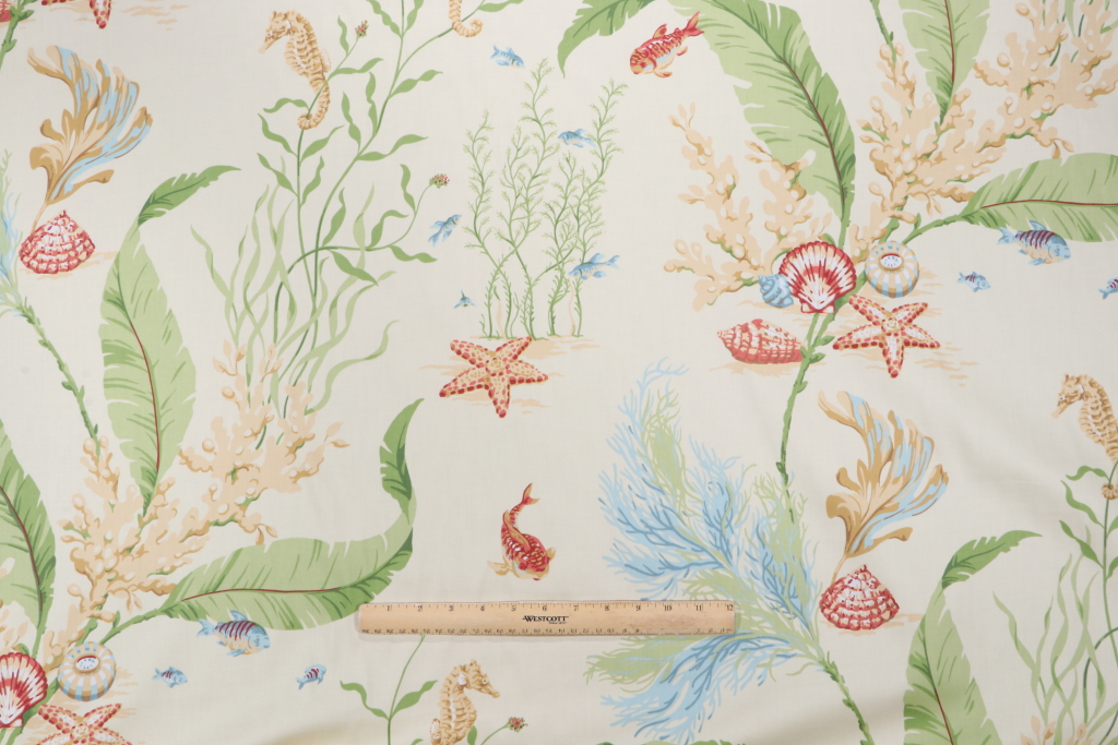 Thibaut Tidal Pool F96704 Printed Cotton Drapery Fabric in Cream is a remnant. Fabric remnants refer to leftover pieces of fabric from production runs at manufacturing sites or pieces that remain from by the yard stock. The lengths of these remnants can vary from a few inches to several yards and are typically sold at a reduced price, since they represent remaining inventory.