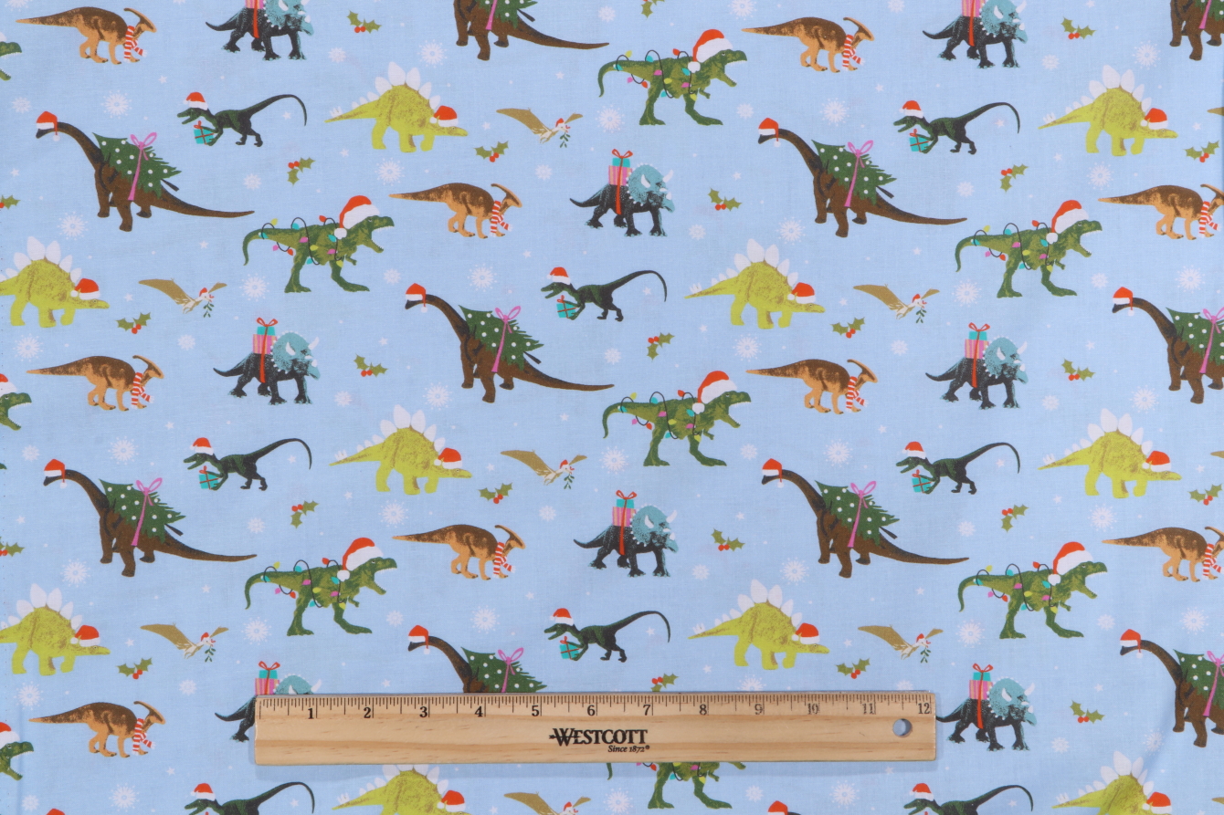 Timeless Treasures Santa-Saurus - Dinosaurs Santa Printed Cotton Craft Fabric in Blue is a remnant, which is sold as a whole piece.