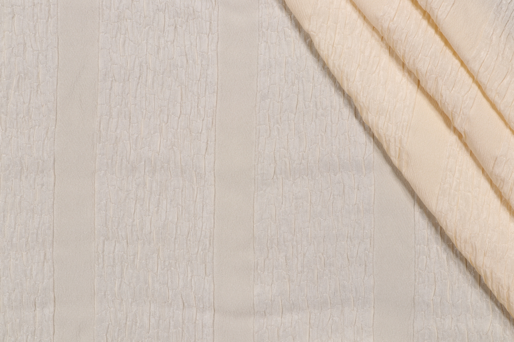 Scalamandre Crushed Stripe Woven Drapery Fabric in Cream is a remnant. Fabric remnants refer to leftover pieces of fabric from production runs at manufacturing sites or pieces that remain from by the yard stock. The lengths of these remnants can vary from a few inches to several yards and are typically sold at a reduced price, since they represent remaining inventory.
