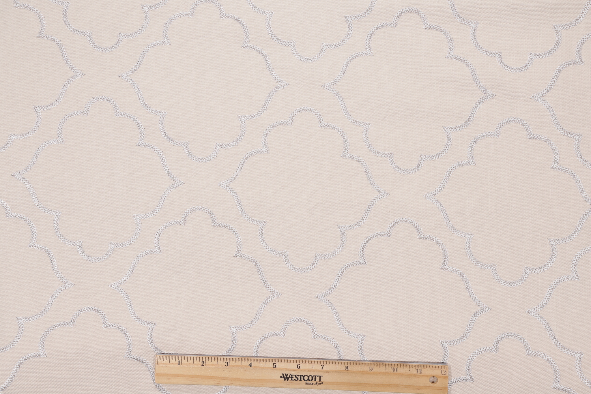 Elegance Embroidered Drapery Fabric in Ivory is a remnant, which is sold as a whole piece.