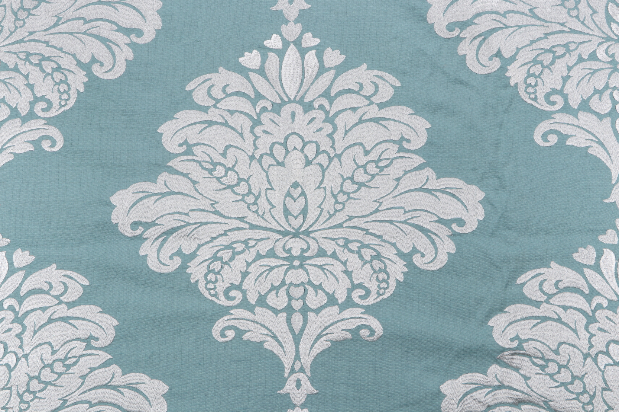 Thibaut Arturo Damask W71305 Embroidered Drapery Fabric in White on Turquoise is a remnant. Fabric remnants refer to leftover pieces of fabric from production runs at manufacturing sites or pieces that remain from by the yard stock. The lengths of these remnants can vary from a few inches to several yards and are typically sold at a reduced price, since they represent remaining inventory.