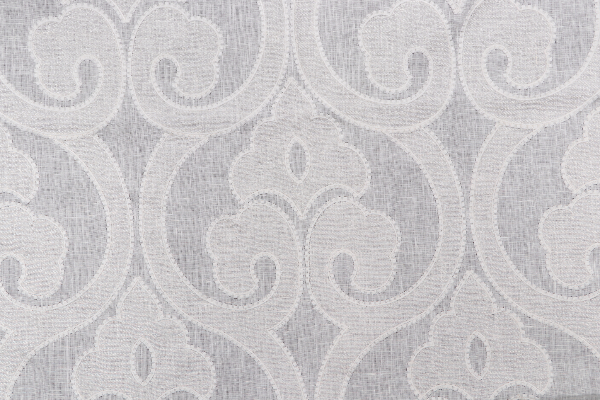 Here we have 1.63 yards of Clovis, a beautiful sheer embroidered linen drapery fabric from Thibaut. This fabric is suitable for short curtains, decorative tiebacks, or smaller window treatments. Note: If you are unsure about the suitability of this fabric for your specific use case please contact us prior to ordering.