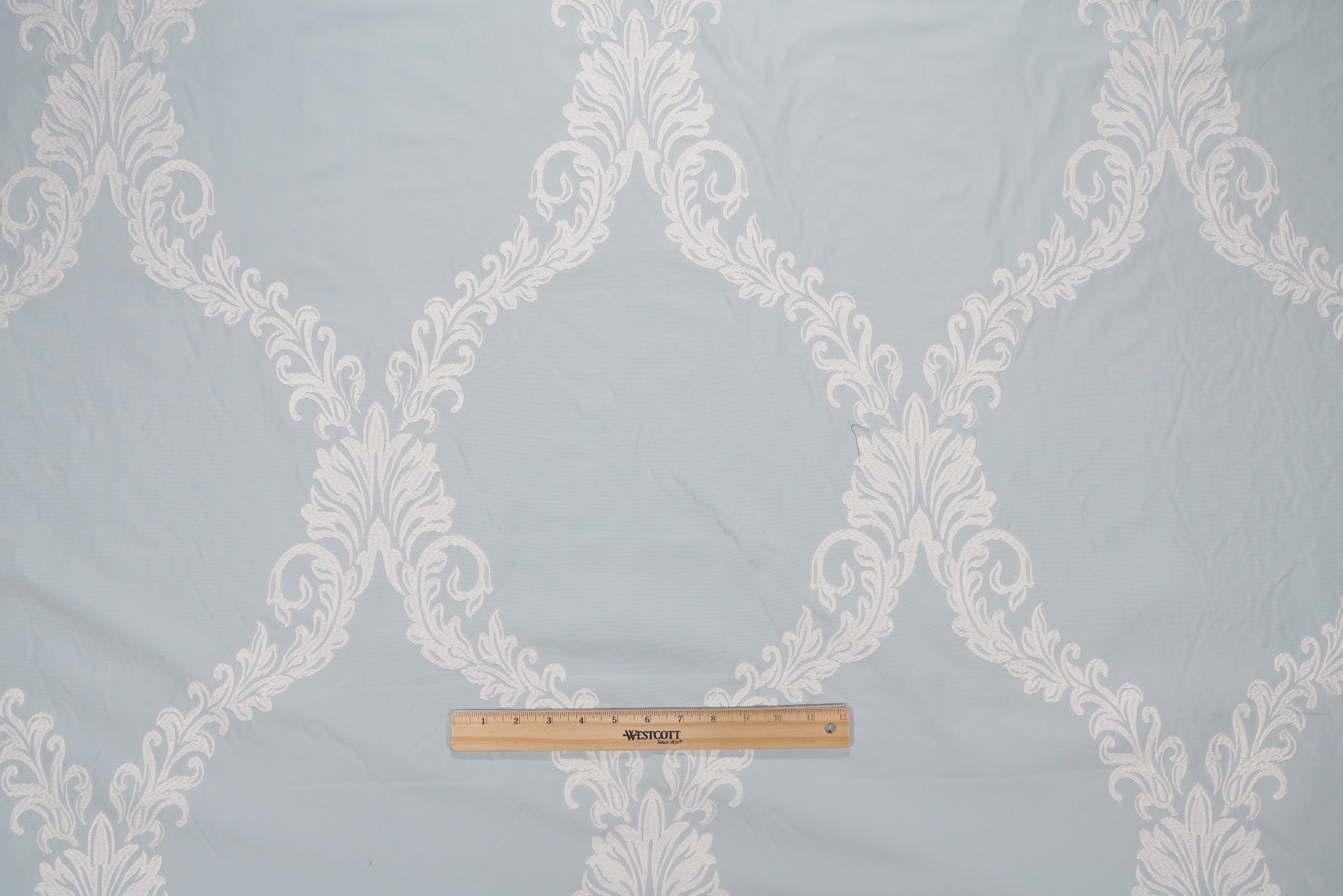If you order a sample of Thibaut Olbia AF26142 Embroidered Drapery Fabric in Aqua the size of the swatch you receive will be approximately 4" x 6". This is enough fabric to verify color and texture, but may not be large enough to capture an entire pattern.