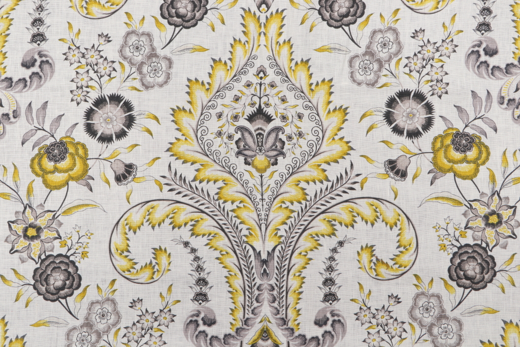 Williamsburg Damask Printed Linen Blend Drapery Fabric in Yellow is a remnant. Fabric remnants refer to leftover pieces of fabric from production runs at manufacturing sites or pieces that remain from by the yard stock. The lengths of these remnants can vary from a few inches to several yards and are typically sold at a reduced price, since they represent remaining inventory.