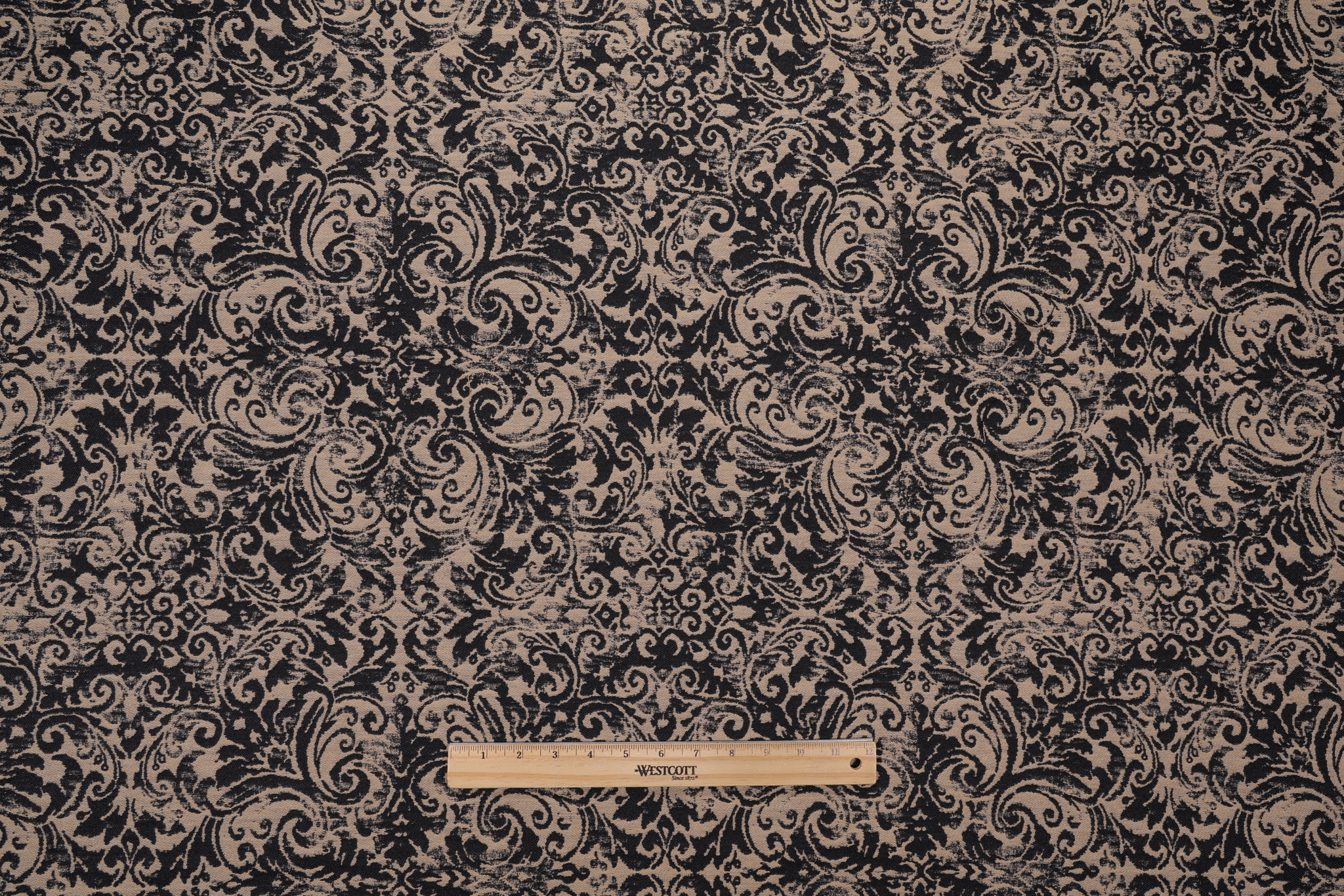 If you order a sample of Covington Priscilla Damask Upholstery Fabric in 936-Black Tan the size of the swatch you receive will be approximately 4" x 6". This is enough fabric to verify color and texture, but may not be large enough to capture an entire pattern.