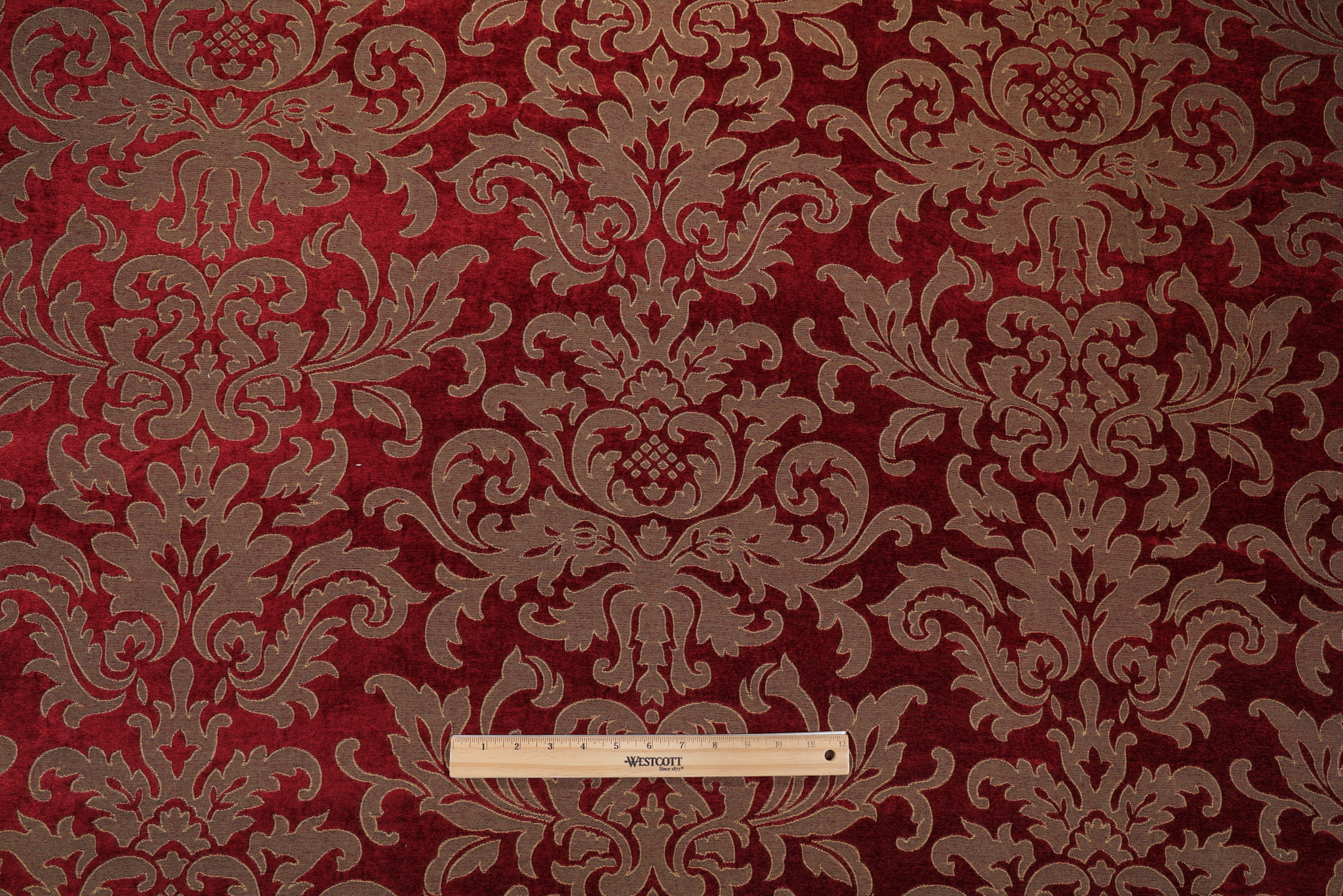 Gaines Woven Chenille Upholstery Fabric in Garnet is a remnant. Fabric remnants refer to leftover pieces of fabric from production runs at manufacturing sites or pieces that remain from by the yard stock. The lengths of these remnants can vary from a few inches to several yards and are typically sold at a reduced price, since they represent remaining inventory.