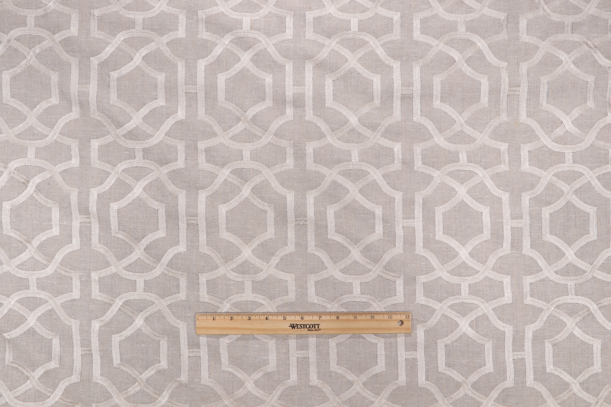 Anna French Alston Trellis W713027 Embroidered Linen Drapery Fabric in Flax for Thibaut is a remnant, which is sold as a whole piece.