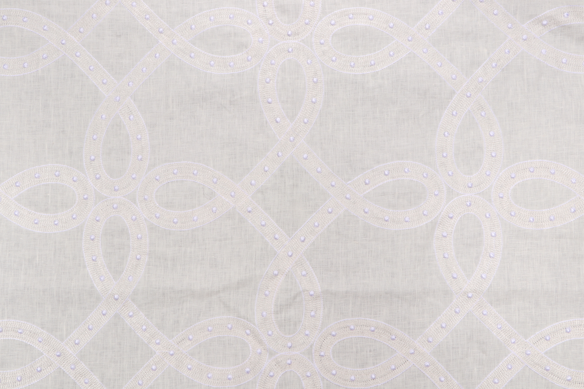 Anna French Salina Ribbon AW1376 Embroidered Drapery Fabric in White for Thibaut is a remnant. Fabric remnants refer to leftover pieces of fabric from production runs at manufacturing sites or pieces that remain from by the yard stock. The lengths of these remnants can vary from a few inches to several yards and are typically sold at a reduced price, since they represent remaining inventory.