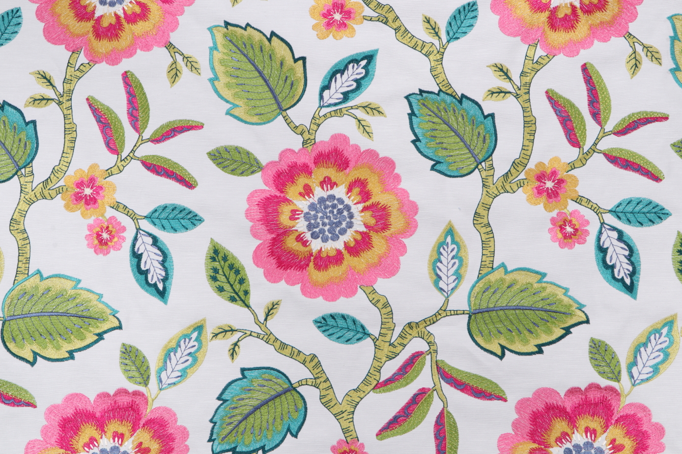 Covington Folk Song Embroidered Drapery Fabric in 787-Begonia Pink is a remnant, which is sold as a whole piece.