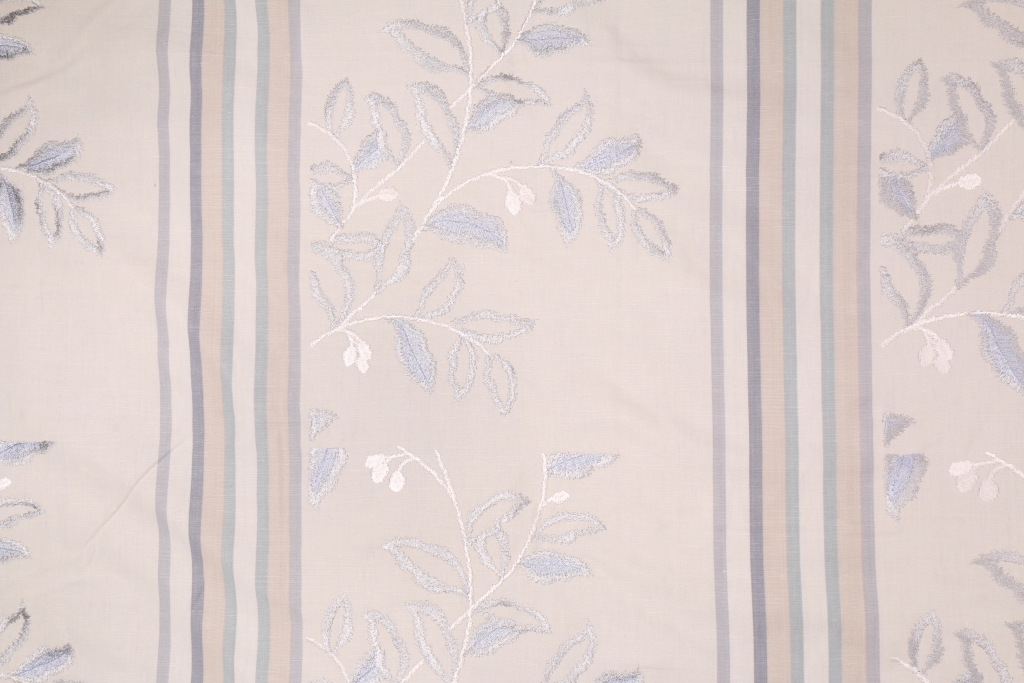 9.2 Yards Embroidered Cotton Decorator Fabric in Blue. This high-end woven decorator fabric is suited for multiple project applications. The weight is excellent for drapery projects, decorative pillows, coverlets, shams and light duty upholstery projects.