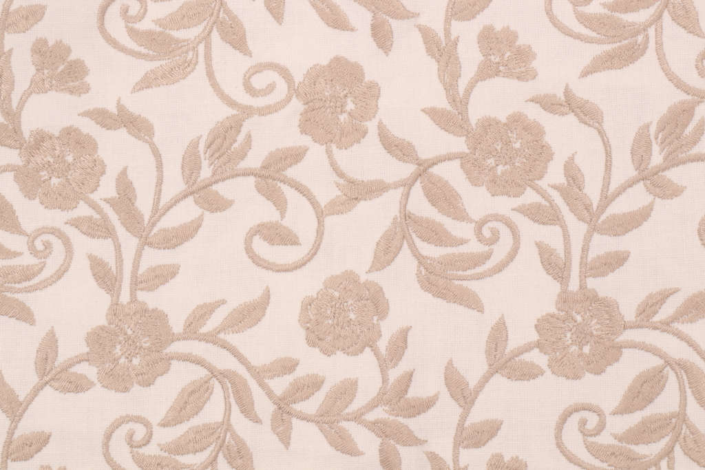 Floral Embroidered Drapery Fabric in Pebble is a remnant. Fabric remnants refer to leftover pieces of fabric from production runs at manufacturing sites or pieces that remain from by the yard stock. The lengths of these remnants can vary from a few inches to several yards and are typically sold at a reduced price, since they represent remaining inventory.
