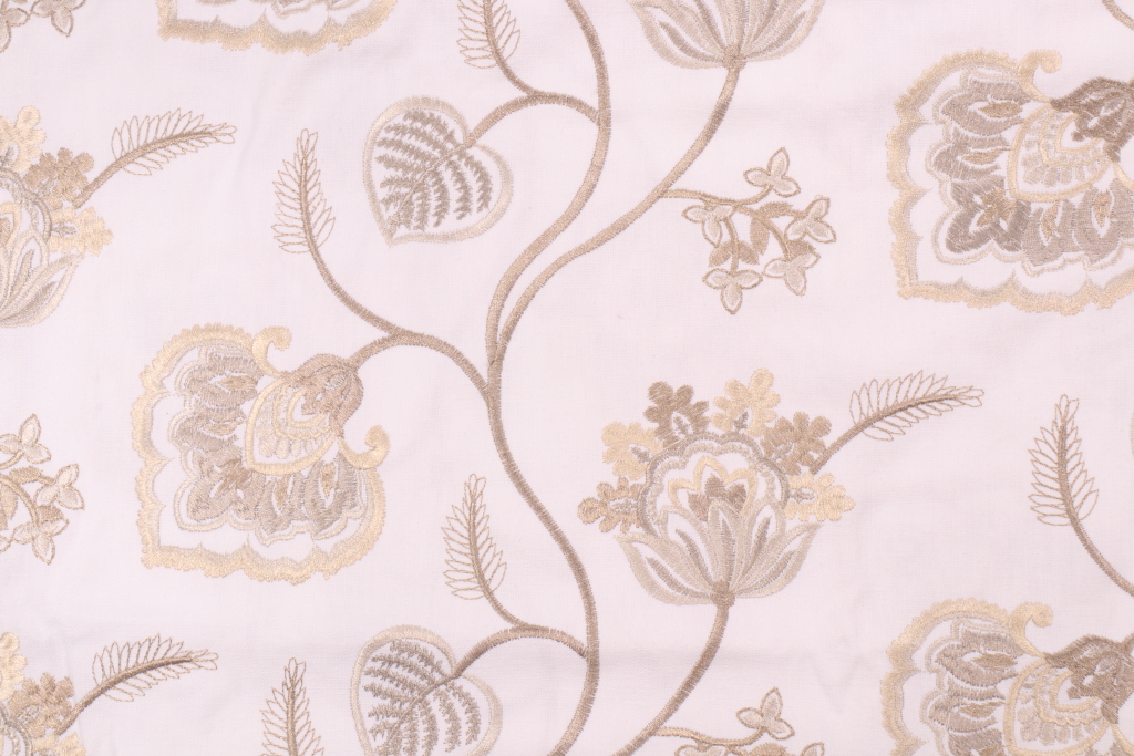 Floral Embroidered Drapery Fabric in Stone is a remnant. Fabric remnants refer to leftover pieces of fabric from production runs at manufacturing sites or pieces that remain from by the yard stock. The lengths of these remnants can vary from a few inches to several yards and are typically sold at a reduced price, since they represent remaining inventory.