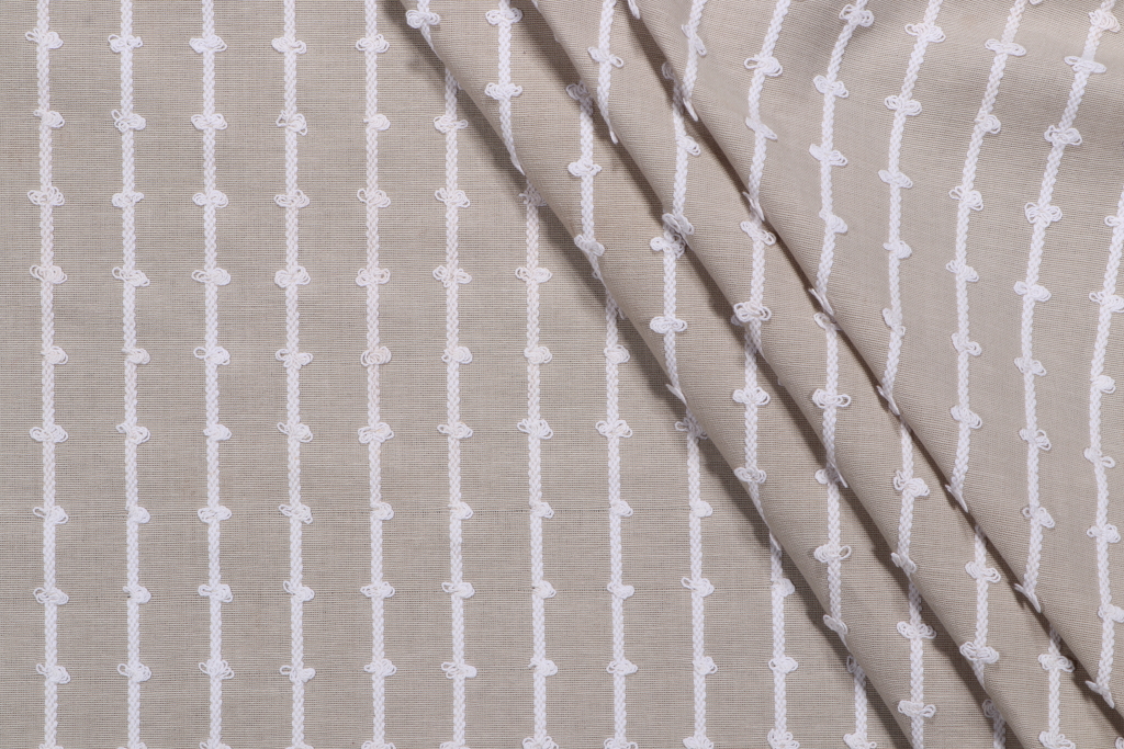 Offering 3.63 yards of Loops, a fine embroidered drapery fabric designed by PK Lifestyles. This fabric is suitable for short curtains, decorative tiebacks, or smaller window treatments. Note: If you are unsure about the suitability of this fabric for your specific use case please contact us prior to ordering.