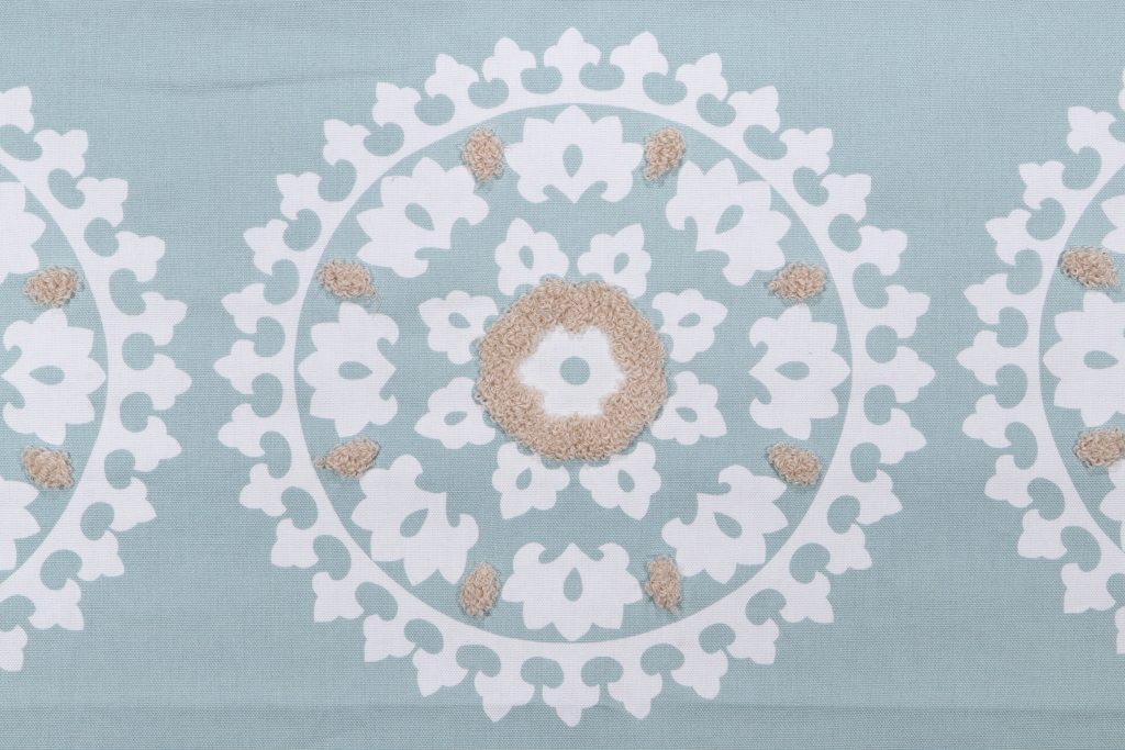 Marisol Printed & Embroidered Drapery Fabric in Spa is a remnant, which is sold as a whole piece.