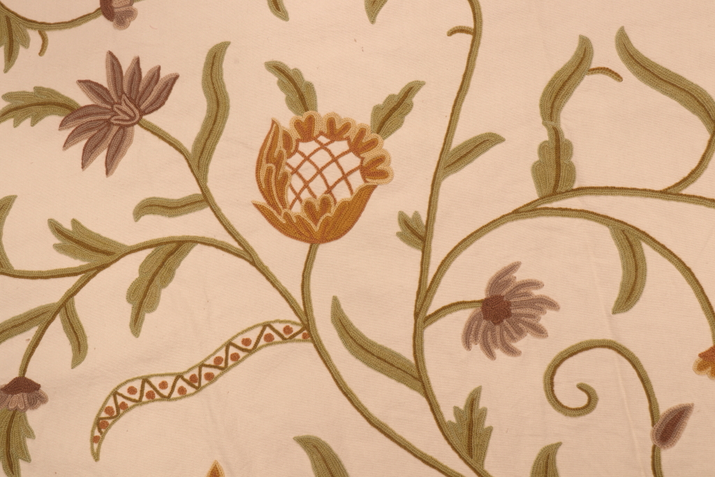 2.38 Yards Old World Weavers Crewel Pomegranate Embroidered Crewel Drapery Fabric in Green and Wheat on Natural.