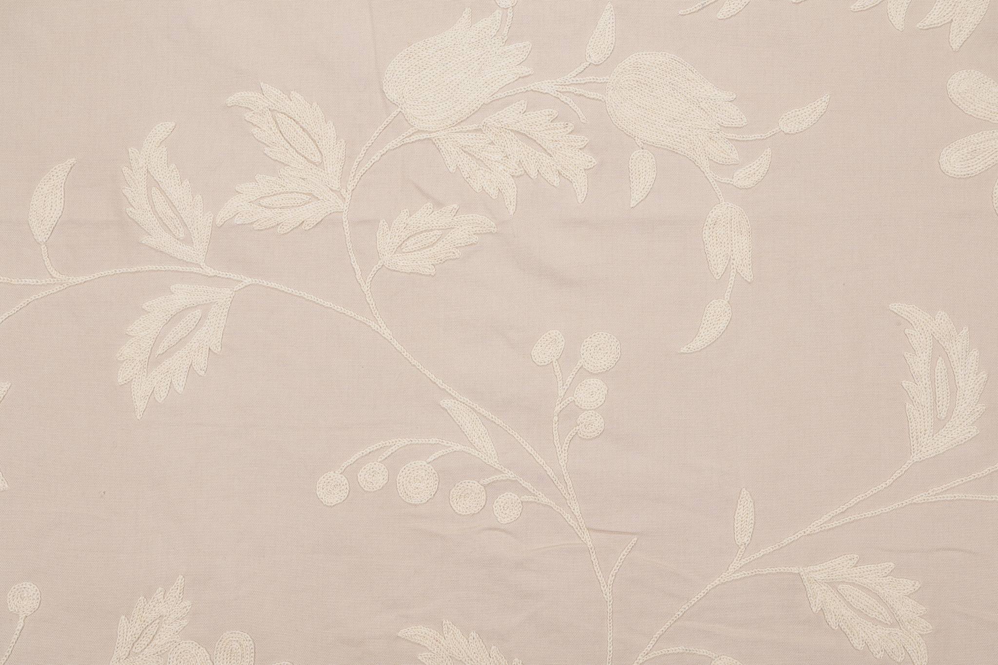 Scalamandre Admar Crewel Embroidered Drapery Fabric in Cream is a remnant. Fabric remnants refer to leftover pieces of fabric from production runs at manufacturing sites or pieces that remain from by the yard stock. The lengths of these remnants can vary from a few inches to several yards and are typically sold at a reduced price, since they represent remaining inventory.