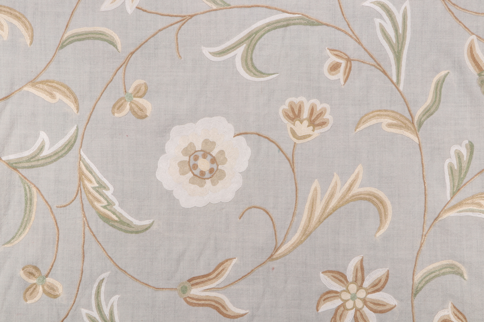 Offering 1.75 yards of Varuni Crewel, a fine embroidered drapery fabric designed by Scalamandre. This fabric is suitable for short curtains, decorative tiebacks, or smaller window treatments. Note: If you are unsure about the suitability of this fabric for your specific use case please contact us prior to ordering.