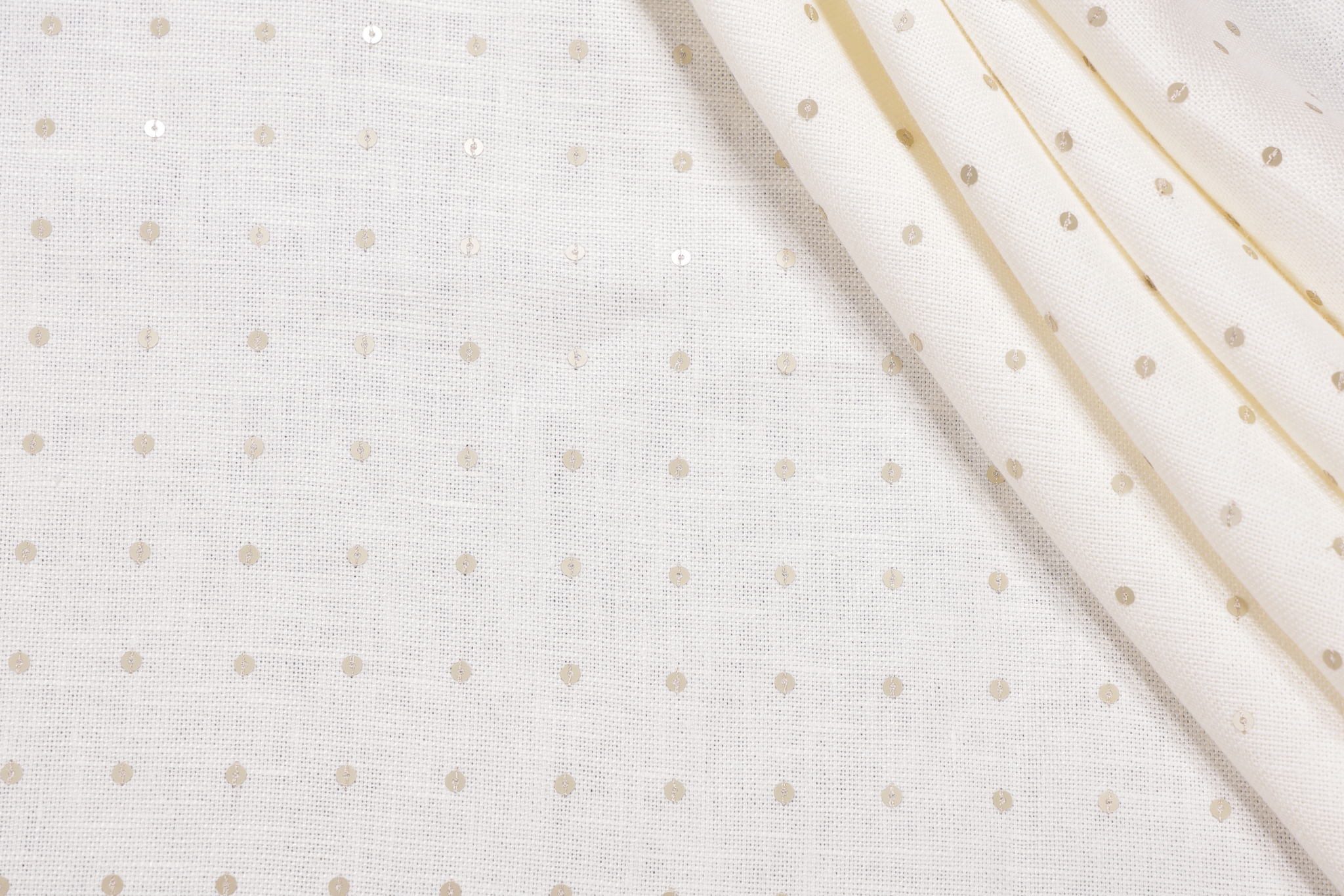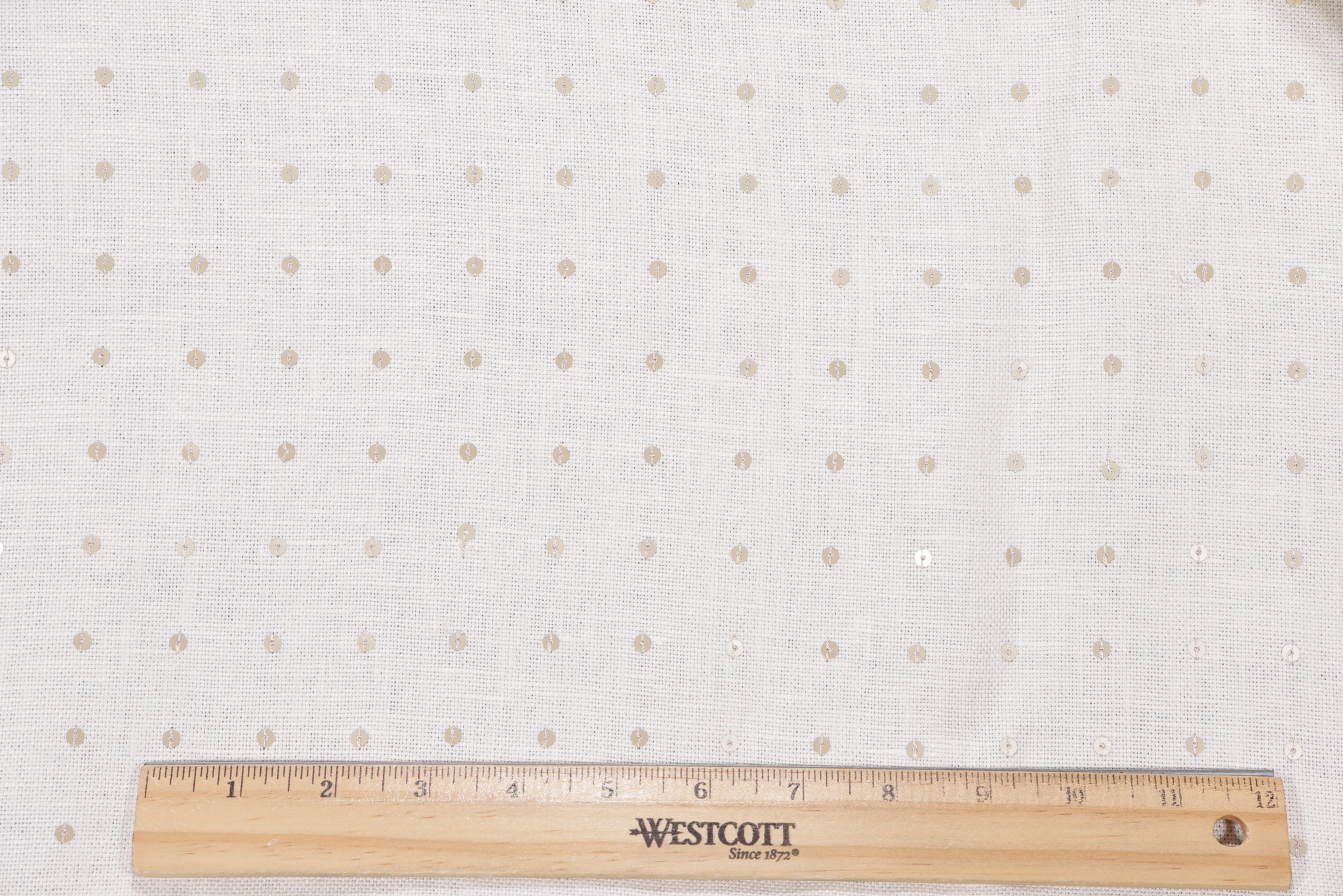 Here we have 2.75 yards of Sequin Linen, a beautifully crafted embroidered drapery fabric. This fabric is suitable for short curtains, decorative tiebacks, or smaller window treatments. Note: If you are unsure about the suitability of this fabric for your specific use case please contact us prior to ordering.